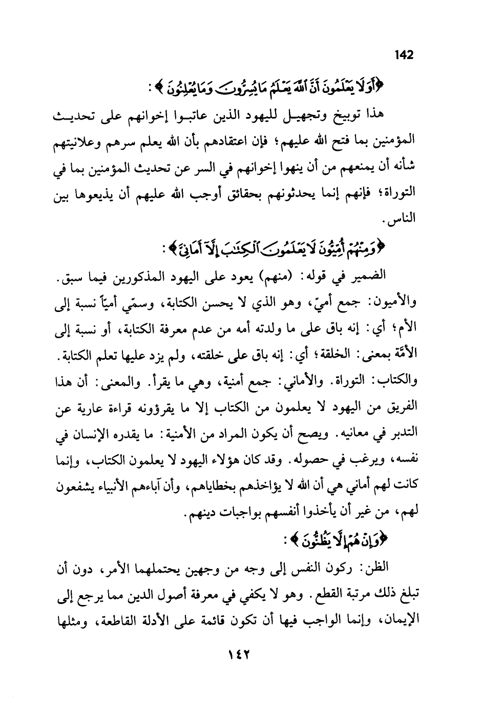 الضمير في قوله: (منهم) يعود على اليهود المذكورين فيما سبق. والأميون: جمع أميّ، وهو الذي لا يحسن الكتابة، وسمّي أميّاً نسبة إلى الأم؛ أي: إنه باق على ما ولدته أمه من عدم معرفة الكتابة، أو نسبة إلى الأمَّة بمعنى: الخلقة؛ أي: إنه باق على خلقته، ولم يزد عليها تعلم الكتابة. والكتاب: التوراة. والأماني: جمع أمنية، وهي ما يقرأ. والمعنى: أن هذا الفريق من اليهود لا يعلمون من الكتاب إلا ما يقرؤونه قراءة عارية عن التدبر في معانيه. ويصح أن يكون المراد من الأمنية: ما يقدره الإنسان في نفسه، ويرغب في حصوله. وقد كان هؤلاء اليهود لا يعلمون الكتاب، وإنما كانت لهم أماني هي أن الله لا يؤاخذهم بخطاياهم، وأن آباءهم الأنبياء يشفعون لهم، من غير أن يأخذوا أنفسهم بواجبات دينهم.