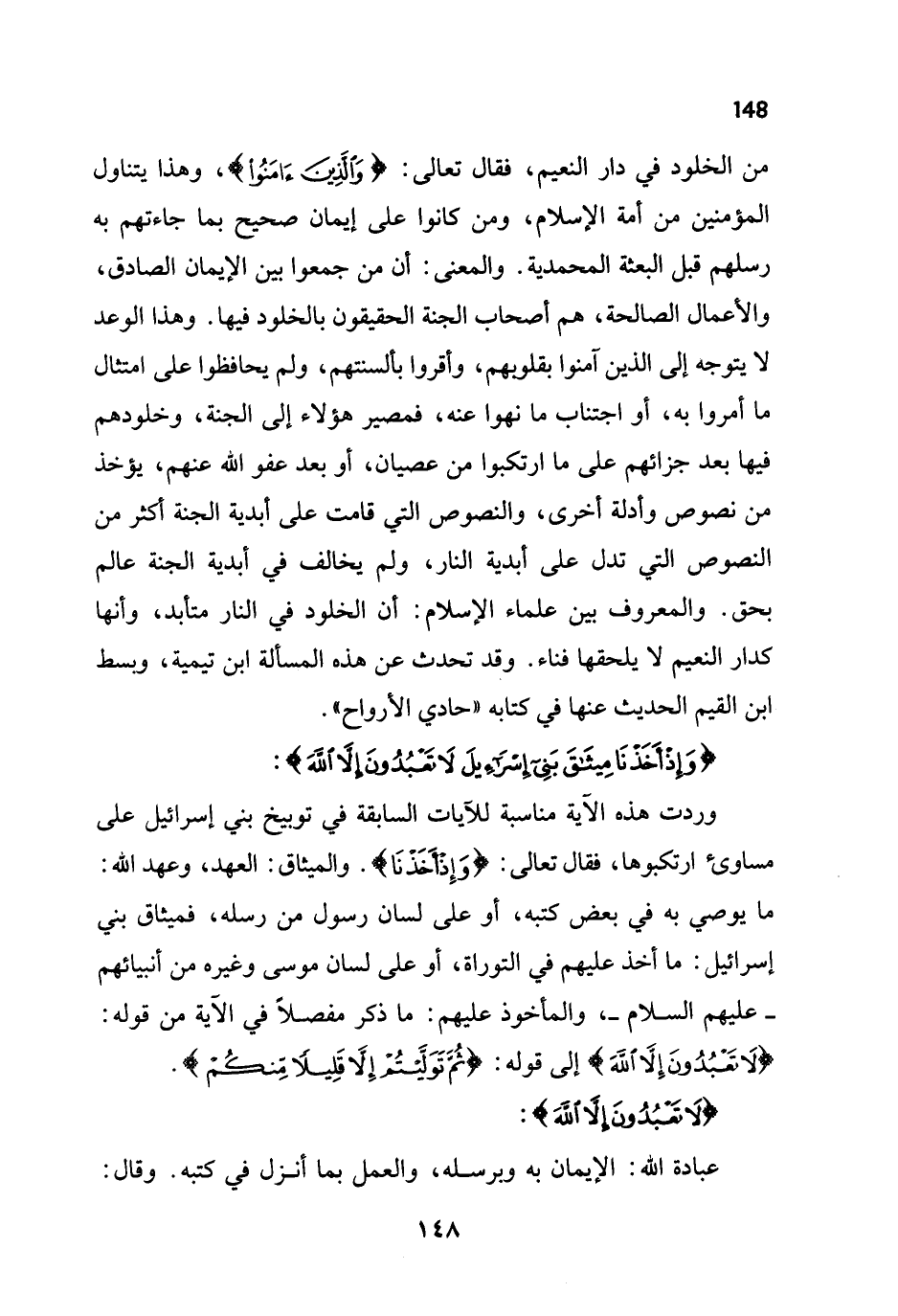 من الخلود في دار النعيم، فقال تعالى: {وَالَّذِينَ آمَنُوا}، وهذا يتناول المؤمنين من أمة الإسلام، ومن كانوا على إيمان صحيح بما جاءتهم به رسلهم قبل البعثة المحمدية. والمعنى: أن من جمعوا بين الإيمان الصادق، والأعمال الصالحة، هم أصحاب الجنة الحقيقون بالخلود فيها. وهذا الوعد لا يتوجه إلى الذين آمنوا بقلويهم، وأقروا بألسنتهم، ولم يحافظوا على امتثال ما أمروا به، أو اجتناب ما نهوا عنه، فمصير هؤلاء إلى الجنة، وخلودهم فيها بعد جزائهم على ما ارتكبوا من عصيان، أو بعد عفو الله عنهم، يؤخذ من نصوص وأدلة أخرى، والنصوص التي قامت على أبدية الجنة أكثر من النصوص التي تدل على أبدية النار، ولم يخالف في أبدية الجنة عالم بحق. والمعروف بين علماء الإسلام: أن الخلود في النار متأبد، وأنها كدار النعيم لا يلحقها فناء. وقد تحدث عن هذه المسألة ابن تيمية، وبسط ابن القيم الحديث عنها في كتابه "حادي الأرواح".