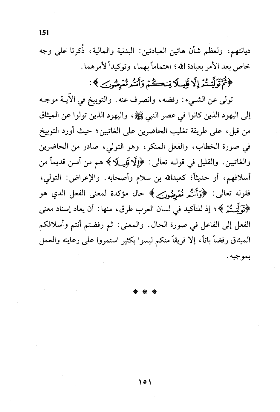 تولى عن الشيء: رفضه، وانصرف عنه. والتوبيخ في الآية موجه إلى اليهود الذين كانوا في عصر النبي - صلى الله عليه وسلم -، واليهود الذين تولوا عن الميثاق من قبل، على طريقة تغليب الحاضرين على الغائبين؛ حيث أورد التوبيخ في صورة الخطاب، والفعل المنكر، وهو التولي، صادر من الحاضرين والغائبين. والقليل في قوله تعالى: {إِلَّا قَلِيلًا} هم من آمن قديماً من أسلافهم، أو حديثاً؛ كعبد الله بن سلام وأصحابه. والإعراض: التولي، فقوله تعالى: {وَأَنْتُمْ مُعْرِضُونَ} حال مؤكدة لمعنى الفعل الذي هو {تَوَلَّيْتُمْ}؛ إذ للتأكيد في لسان العرب طرق، منها: أن يعاد إسناد معنى الفعل إلى الفاعل في صورة الحال. والمعنى: ثم رفضتم أنتم وأسلافكم الميثاق رفضاً باتاً، إلا فريقاً منكم ليسوا بكثير استمروا على رعايته والعمل بموجبه.