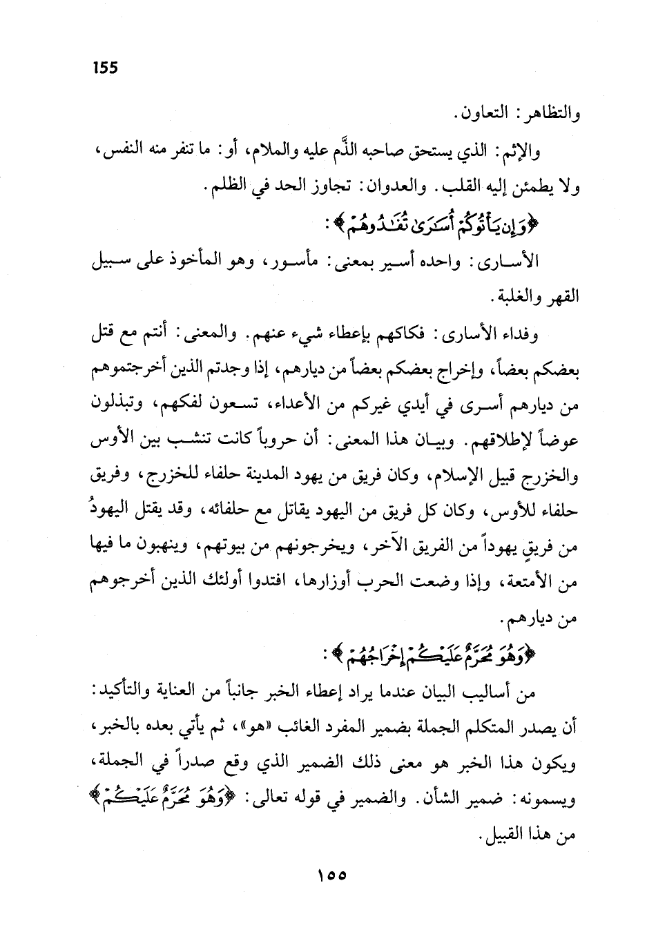 وفداء الأسارى: فكاكهم بإعطاء شيء عنهم. والمعنى: أنتم مع قتل بعضكم بعضاً، وإخراج بعضكم بعضاً من ديارهم، إذا وجدتم الذين أخرجتموهم من ديارهم أسرى في أيدي غيركم من الأعداء، تسعون لفكهم، وتبذلون عوضاً لإطلاقهم. وبيان هذا المعنى: أن حروباً كانت تنشب بين الأوس والخزرج قبيل الإسلام، وكان فريق من يهود المدينة حلفاء للخزرج، وفريق حلفاء للأوس، وكان كل فريق من اليهود يقاتل مع حلفائه، وقد يقتل اليهودُ من فريقٍ يهوداً من الفريق الآخر، ويخرجونهم من بيوتهم، وينهبون ما فيها من الأمتعة، وإذا وضعت الحرب أوزارها، افتدوا أولئك الذين أخرجوهم من ديارهم.