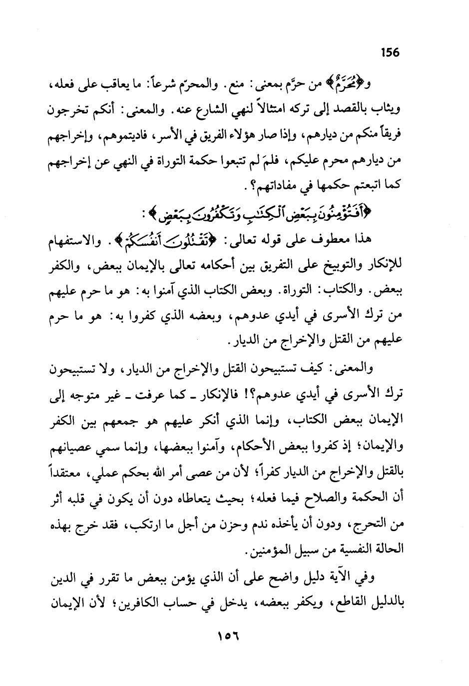 والمعنى: كيف تستبيحون القتل والإخراج من الديار، ولا تستبيحون ترك الأسرى في أيدي عدوهم؟! فالإنكار-كما عرفت- غير متوجه إلى الإيمان ببعض الكتاب، وإنما الذي أنكر عليهم هو جمعهم بين الكفر والإيمان؛ إذ كفروا ببعض الأحكام، وآمنوا ببعضها، وإنما سمي عصيانهم بالقتل والإخراج من الديار كفراً؛ لأن من عصى أمر الله بحكم عملي، معتقداً أن الحكمة والصلاح فيما فعله؛ بحيث يتعاطاه دون أن يكون في قلبه أثر من التحرج، ودون أن يأخذه ندم وحزن من أجل ما ارتكب، فقد خرج بهذه الحالة النفسية من سبيل المؤمنين.