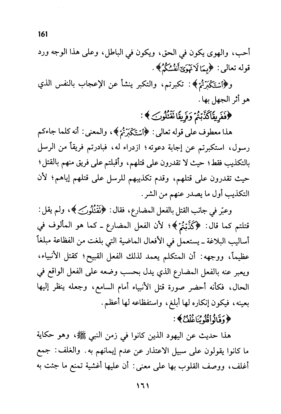 وعبّر في جانب القتل بالفعل المضارع، فقال: {تَقْتُلُونَ}، ولم يقل: قتلتم كما قال: {كَذَّبْتُمْ}؛ لأن الفعل المضارع- كما هو المألوف في أساليب البلاغة- يستعمل في الأفعال الماضية التي بلغت من الفظاعة مبلغاً عظيماً، ووجهه: أن المتكلم يعمد لذلك الفعل القبيح؛ كقتل الأنبياء، ويعبر عنه بالفعل المضارع الذي يدل بحسب وضعه على الفعل الواقع في الحال، فكأنه أحضر صورة قتل الأنبياء أمام السامع، وجعله ينظر إليها بعينه، فيكون إنكاره لها أبلغ، واستفظاعه لها أعظم.