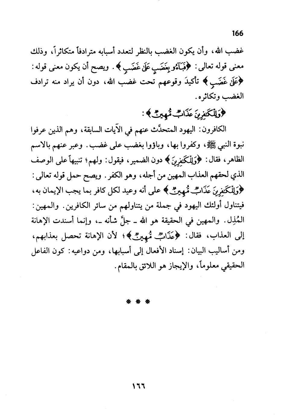 غضب الله، وأن يكون الغضب بالنظر لتعدد أسبابه مترادفاً متكاثراً، وذلك معنى قوله تعالى: {فَبَاءُوا بِغَضَبٍ عَلَى غَضَبٍ}. ولصح أن يكون معنى قوله: {عَلَى غَضَبٍ} تأكيدَ وقوعهم تحت غضب الله، دون أن يراد منه ترادف الغضب وتكاثره.