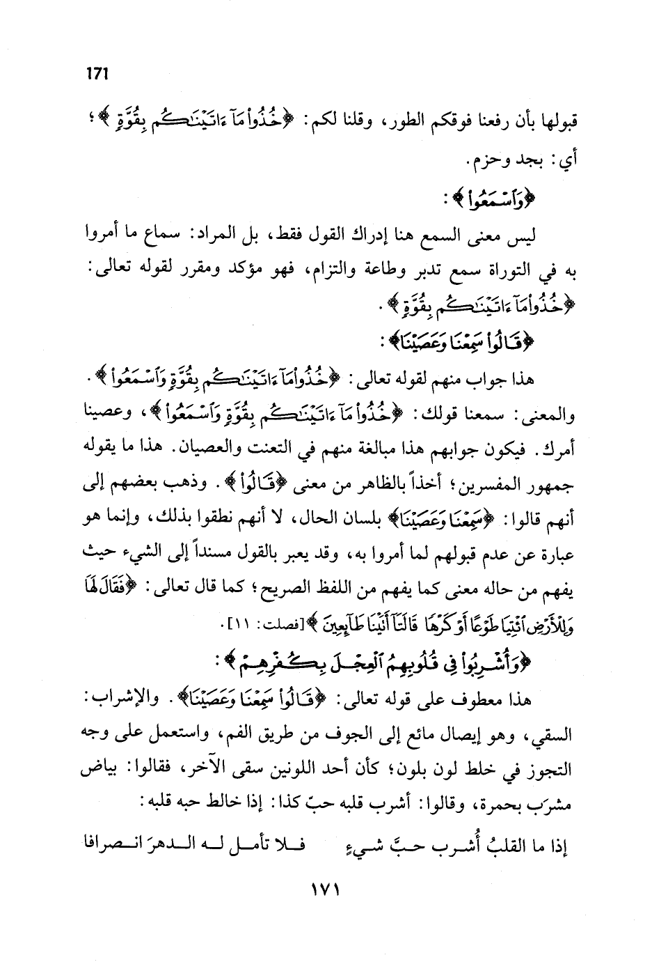 هذا جواب منهم لقوله تعالى: {خُذُوا مَا آتَيْنَاكُمْ بِقُوَّةٍ وَاسْمَعُوا}. والمعنى: سمعنا قولك: {خُذُوا مَا آتَيْنَاكُمْ بِقُوَّةٍ وَاسْمَعُوا}، وعصينا أمرك. فيكون جوابهم هذا مبالغة منهم في التعنت والعصيان. هذا ما يقوله جمهور المفسرين؛ أخذاً بالظاهر من معنى {قَالُوا}. وذهب بعضهم إلى أنهم قالوا: {سَمِعْنَا وَعَصَيْنَا} بلسان الحال، لا أنهم نطقوا بذلك، وإنما هو عبارة عن عدم قبولهم لما أمروا به، وقد يعبر بالقول مسنداً إلى الشيء حيث يفهم من حاله معنى كما يفهم من اللفظ الصريح؛ كما قال تعالى: {فَقَالَ لَهَا وَلِلْأَرْضِ ائْتِيَا طَوْعًا أَوْ كَرْهًا قَالَتَا أَتَيْنَا طَائِعِينَ} [فصلت: 11].