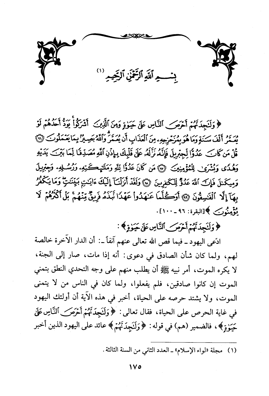 {وَلَتَجِدَنَّهُمْ أَحْرَصَ النَّاسِ عَلَى حَيَاةٍ وَمِنَ الَّذِينَ أَشْرَكُوا يَوَدُّ أَحَدُهُمْ لَوْ يُعَمَّرُ أَلْفَ سَنَةٍ وَمَا هُوَ بِمُزَحْزِحِهِ مِنَ الْعَذَابِ أَنْ يُعَمَّرَ وَاللَّهُ بَصِيرٌ بِمَا يَعْمَلُونَ (96) قُلْ مَنْ كَانَ عَدُوًّا لِجِبْرِيلَ فَإِنَّهُ نَزَّلَهُ عَلَى قَلْبِكَ بِإِذْنِ اللَّهِ مُصَدِّقًا لِمَا بَيْنَ يَدَيْهِ وَهُدًى وَبُشْرَى لِلْمُؤْمِنِينَ (97) مَنْ كَانَ عَدُوًّا لِلَّهِ وَمَلَائِكَتِهِ وَرُسُلِهِ وَجِبْرِيلَ وَمِيكَالَ فَإِنَّ اللَّهَ عَدُوٌّ لِلْكَافِرِينَ (98) وَلَقَدْ أَنْزَلْنَا إِلَيْكَ آيَاتٍ بَيِّنَاتٍ وَمَا يَكْفُرُ بِهَا إِلَّا الْفَاسِقُونَ (99) أَوَكُلَّمَا عَاهَدُوا عَهْدًا نَبَذَهُ فَرِيقٌ مِنْهُمْ بَلْ أَكْثَرُهُمْ لَا يُؤْمِنُونَ} [البقرة: 96 - 100].