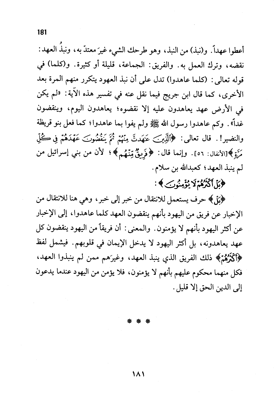 {بَلْ} حرف يستعمل للانتقال من خبر إلى خبر، وهي هنا للانتقال من الإخبار عن فريق من اليهود بأنهم ينقضون العهد كلما عاهدوا، إلى الإخبار عن أكثر اليهود بأنهم لا يؤمنون. والمعنى: أن فريقاً من اليهود ينقضون كل عهد يعاهدونه، بل أكثر اليهود لا يدخل الإيمان في قلوبهم. فيشمل لفظ {أَكْثَرُهُمْ} ذلك الفريق الذي ينبذ العهد، وغيرَهم ممن لم ينبذوا العهد، فكل منهما محكوم عليهم بأنهم لا يؤمنون، فلا يؤمن من اليهود عندما يدعون إلى الدين الحق إلا قليل.