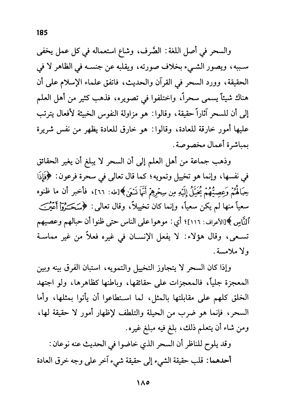 وإذا كان السحر لا يتجاوز التخييل والتمويه، استبان الفرق بينه وبين المعجزة جلياً، فالمعجزات على حقائقها، وباطنها كظاهرها، ولو اجتهد الخلق كلهم على مقابلتها بالمثل، لما استطاعوا أن يأتوا بمثلها، وأما السحر، فإنما هو ضرب من الحيلة والتلطف لإظهار أمور لا حقيقة لها، ومن شاء أن يتعلم ذلك، بلغ فيه مبلغ غيره.