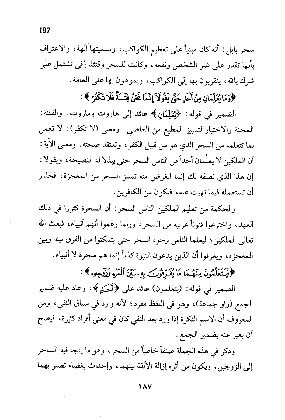 وذكر في هذه الجملة صنفاً خاصاً من السحر، وهو ما يتجه فيه الساحر إلى الزوجين، ويكون من أثره إزالة الألفة بينهما، وإحداث بغضاء تصير بهما