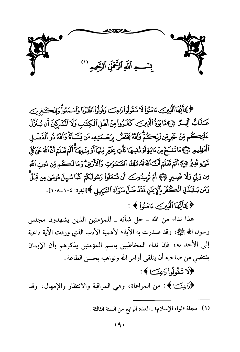 {يَاأَيُّهَا الَّذِينَ آمَنُوا لَا تَقُولُوا رَاعِنَا وَقُولُوا انْظُرْنَا وَاسْمَعُوا وَلِلْكَافِرِينَ عَذَابٌ أَلِيمٌ (104) مَا يَوَدُّ الَّذِينَ كَفَرُوا مِنْ أَهْلِ الْكِتَابِ وَلَا الْمُشْرِكِينَ أَنْ يُنَزَّلَ عَلَيْكُمْ مِنْ خَيْرٍ مِنْ رَبِّكُمْ وَاللَّهُ يَخْتَصُّ بِرَحْمَتِهِ مَنْ يَشَاءُ وَاللَّهُ ذُو الْفَضْلِ الْعَظِيمِ (105) مَا نَنْسَخْ مِنْ آيَةٍ أَوْ نُنْسِهَا نَأْتِ بِخَيْرٍ مِنْهَا أَوْ مِثْلِهَا أَلَمْ تَعْلَمْ أَنَّ اللَّهَ عَلَى كُلِّ شَيْءٍ قَدِيرٌ (106) أَلَمْ تَعْلَمْ أَنَّ اللَّهَ لَهُ مُلْكُ السَّمَاوَاتِ وَالْأَرْضِ وَمَا لَكُمْ مِنْ دُونِ اللَّهِ مِنْ وَلِيٍّ وَلَا نَصِيرٍ (107) أَمْ تُرِيدُونَ أَنْ تَسْأَلُوا رَسُولَكُمْ كَمَا سُئِلَ مُوسَى مِنْ قَبْلُ وَمَنْ يَتَبَدَّلِ الْكُفْرَ بِالْإِيمَانِ فَقَدْ ضَلَّ سَوَاءَ السَّبِيلِ} [البقرة: 104 - 108].