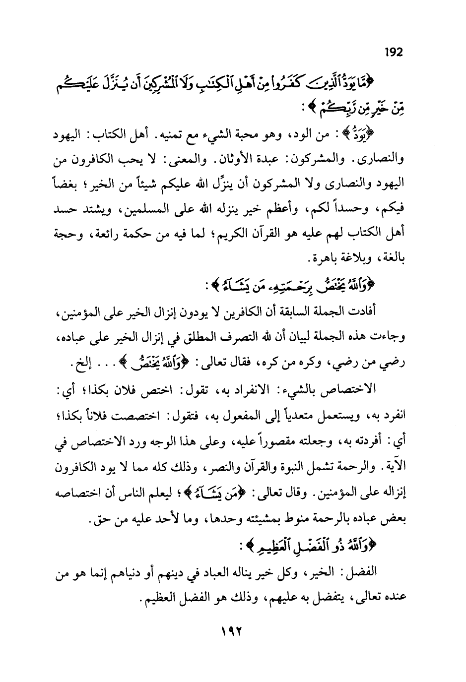 {يَوَدُّ}: من الود، وهو محبة الشيء مع تمنيه. أهل الكتاب: اليهود والنصارى. والمشركون: عبدة الأوثان. والمعنى: لا يحب الكافرون من اليهود والنصارى ولا المشركون أن ينزِّل الله عليكم شيئاً من الخير؛ بغضاً فيكم، وحسداً لكم، وأعظم خير ينزله الله على المسلمين، ويشتد حسد أهل الكتاب لهم عليه هو القرآن الكريم؛ لما فيه من حكمة رائعة، وحجة بالغة، وبلاغة باهرة.
