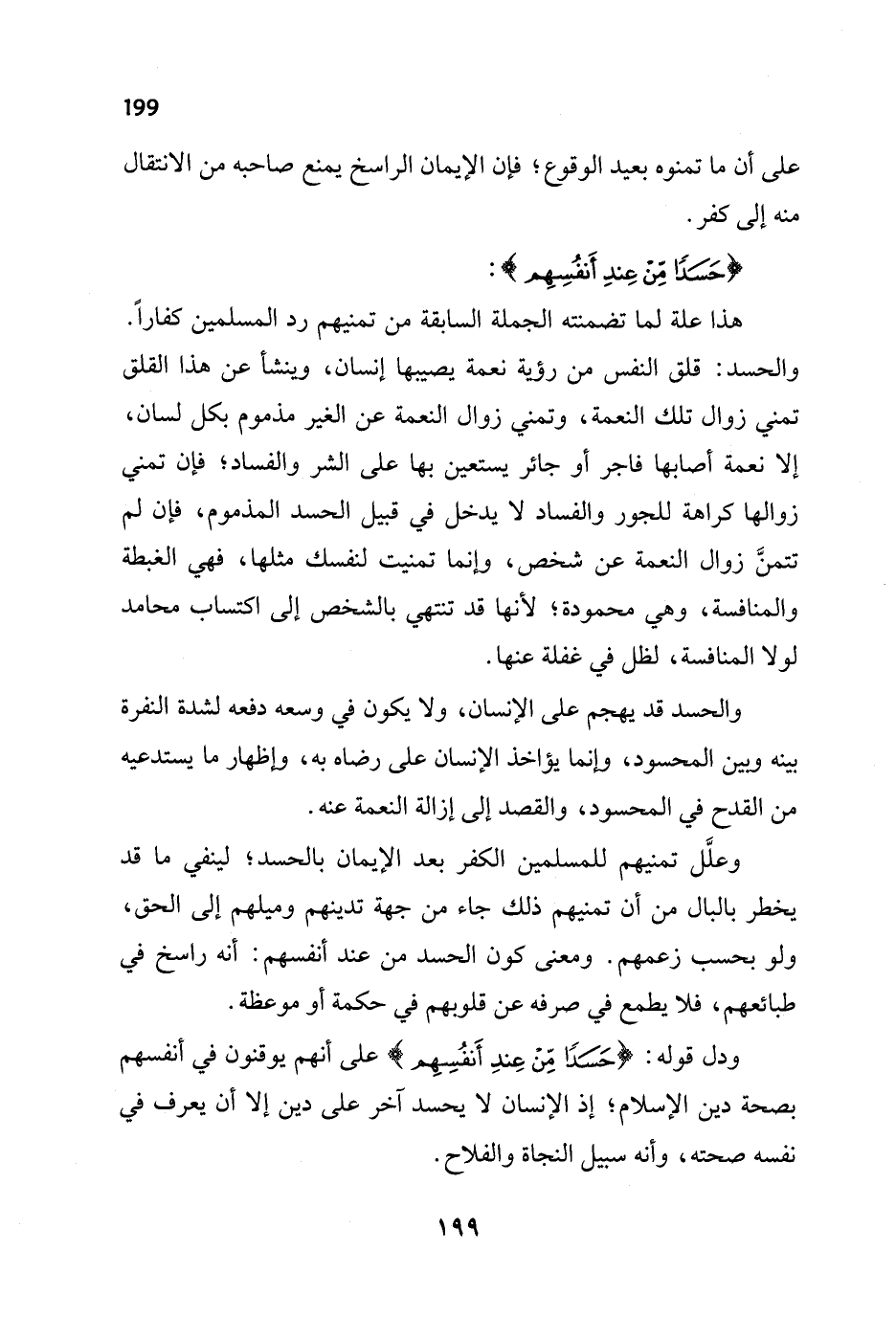 هذا علة لما تضمنته الجملة السابقة من تمنيهم رد المسلمين كفاراً. والحسد: قلق النفس من رؤية نعمة يصيبها إنسان، وينشأ عن هذا القلق تمني زوال تلك النعمة، وتمني زوال النعمة عن الغير مذموم بكل لسان، إلا نعمة أصابها فاجر أو جائر يستعين بها على الشر والفساد؛ فإن تمني زوالها كراهة للجور والفساد لا يدخل في قبيل الحسد المذموم، فإن لم تتمنَّ زوال النعمة عن شخص، وإنما تمنيت لنفسك مثلها، فهي الغبطة والمنافسة، وهي محمود؛ لأنها قد تنتهي بالشخص إلى اكتساب محامد لولا المنافسة، لظل في غفلة عنها.