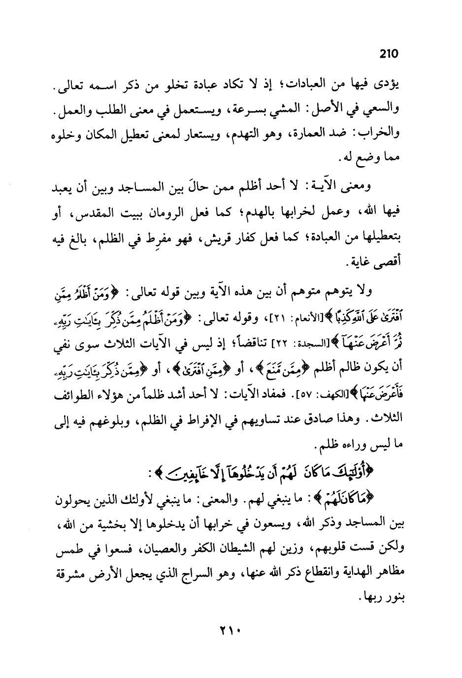 ومعنى الآية: لا أحد أظلم ممن حالَ بين المساجد وبين أن يعبد فيها الله، وعمل لخرابها بالهدم؛ كما فعل الرومان ببيت المقدس، أو بتعطيلها من العبادة؛ كما فعل كفار قريش، فهو مفرِط في الظلم، بالغ فيه أقصى غاية.