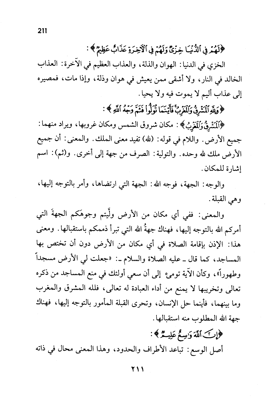 {الْمَشْرِقُ وَالْمَغْرِبُ}: مكان شروق الشمس ومكان غروبها، ويراد منهما: جميع الأرض. واللام في قوله: (لله) تفيد معنى الملك. والمعنى: أن جميع الأرض ملك لله وحده. والتولية: الصرف من جهة إلى أخرى. و (ثم): اسم إشارة للمكان.