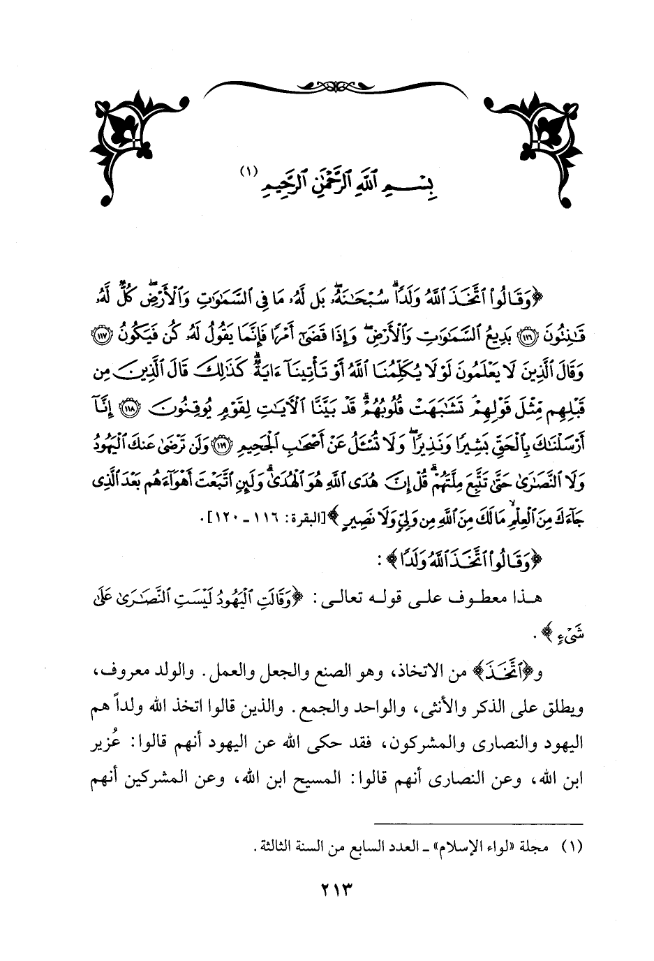 {وَقَالُوا اتَّخَذَ اللَّهُ وَلَدًا سُبْحَانَهُ بَلْ لَهُ مَا فِي السَّمَاوَاتِ وَالْأَرْضِ كُلٌّ لَهُ قَانِتُونَ (116) بَدِيعُ السَّمَاوَاتِ وَالْأَرْضِ وَإِذَا قَضَى أَمْرًا فَإِنَّمَا يَقُولُ لَهُ كُنْ فَيَكُونُ (117) وَقَالَ الَّذِينَ لَا يَعْلَمُونَ لَوْلَا يُكَلِّمُنَا اللَّهُ أَوْ تَأْتِينَا آيَةٌ كَذَلِكَ قَالَ الَّذِينَ مِنْ قَبْلِهِمْ مِثْلَ قَوْلِهِمْ تَشَابَهَتْ قُلُوبُهُمْ قَدْ بَيَّنَّا الْآيَاتِ لِقَوْمٍ يُوقِنُونَ (118) إِنَّا أَرْسَلْنَاكَ بِالْحَقِّ بَشِيرًا وَنَذِيرًا وَلَا تُسْأَلُ عَنْ أَصْحَابِ الْجَحِيمِ (119) وَلَنْ تَرْضَى عَنْكَ الْيَهُودُ وَلَا النَّصَارَى حَتَّى تَتَّبِعَ مِلَّتَهُمْ قُلْ إِنَّ هُدَى اللَّهِ هُوَ الْهُدَى وَلَئِنِ اتَّبَعْتَ أَهْوَاءَهُمْ بَعْدَ الَّذِي جَاءَكَ مِنَ الْعِلْمِ مَا لَكَ مِنَ اللَّهِ مِنْ وَلِيٍّ وَلَا نَصِيرٍ} [البقرة: 116 - 120].