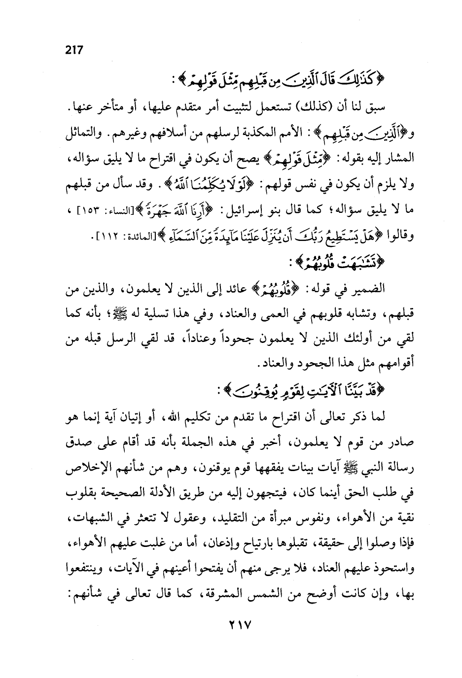 سبق لنا أن (كذلك) تستعمل لتئبيت أمر متقدم عليها، أو متأخر عنها. و {الَّذِينَ مِنْ قَبْلِهِمْ}: الأمم المكذبة لرسلهم من أسلافهم وغيرهم. والتماثل المشار إليه بقوله: {مِثْلَ قَوْلِهِمْ} يصح أن يكون في اقترل ما لا يليق سؤاله، ولا يلزم أن يكون في نفس قولهم: {لَوْلَا يُكَلِّمُنَا اللَّهُ}. وقد سأل من قبلهم ما لا يليق سؤاله؛ كما قال بنو إسرائيل: {أَرِنَا اللَّهَ جَهْرَةً} [النساء: 153]، وقالوا {هَلْ يَسْتَطِيعُ رَبُّكَ أَنْ يُنَزِّلَ عَلَيْنَا مَائِدَةً مِنَ السَّمَاءِ} [المائدة: 112].