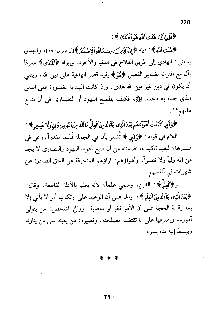 {هُدَى اللَّهِ}: دينه {إِنَّ الدِّينَ عِنْدَ اللَّهِ الْإِسْلَامُ} [آل عمران: 19]، والهدى بمعنى: الهادي إلى طريق الفلاح في الدنيا والآخرة. وإيراد {الْهُدَى} معرفاً بأل مع اقترانه بضمير الفصل {هُوَ} يفيد قصر الهداية على دين الله، وينفي أن يكون في دين غير دين الله هدى. وإذا كانت الهداية مقصورة على الدين الذي جاء به محمد - صلى الله عليه وسلم -، فكيف يطمع اليهود أو النصارى في أن يتبع ملتهم؟!.