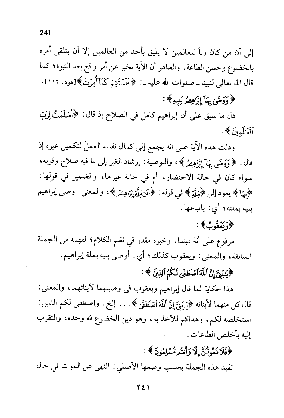 ودلت هذه الآية على أنه يجمع إلى كمال نفسه العملَ لتكميل غيره إذ قال: {وَوَصَّى بِهَا}، والتوصية: إرشاد الغير إلى ما فيه صلاح وقربة، سواء كان في حالة الاحتضار، أم في حالة غيرها، والضمير في قولها: {بِهَا} يعود إلى {مِلَّةِ} في قوله: {عَنْ مِلَّةِ إِبْرَاهِيمَ}، والمعنى: وصى إبراهيم بنيه بملته؛ أي: باتباعها.