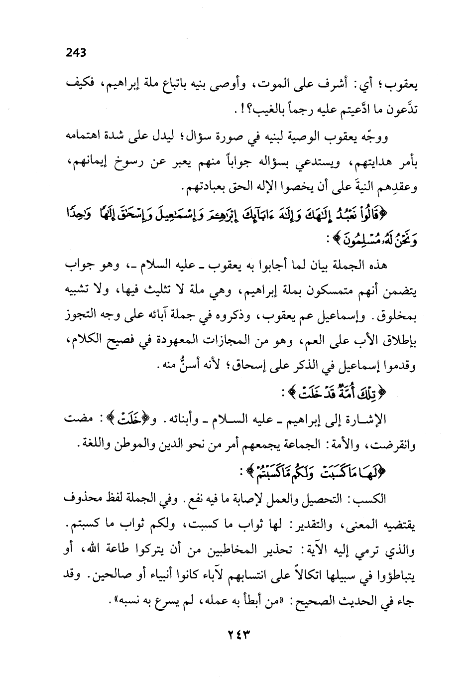 الكسب: التحصيل والعمل لإصابة ما فيه نفع. وفي الجملة لفظ محذوف يقتضيه المعنى، والتقدير: لها ثواب ما كسبت، ولكم ثواب ما كسبتم. والذي ترمي إليه الآية: تحذير المخاطبين من أن يتركوا طاعة الله، أو يتباطؤوا في سبيلها اتكالاً على انتسابهم لآباء كانوا أنبياء أو صالحين. وقد جاء في الحديث الصحيح: "من أبطأ به عمله، لم يسرع به نسبه".