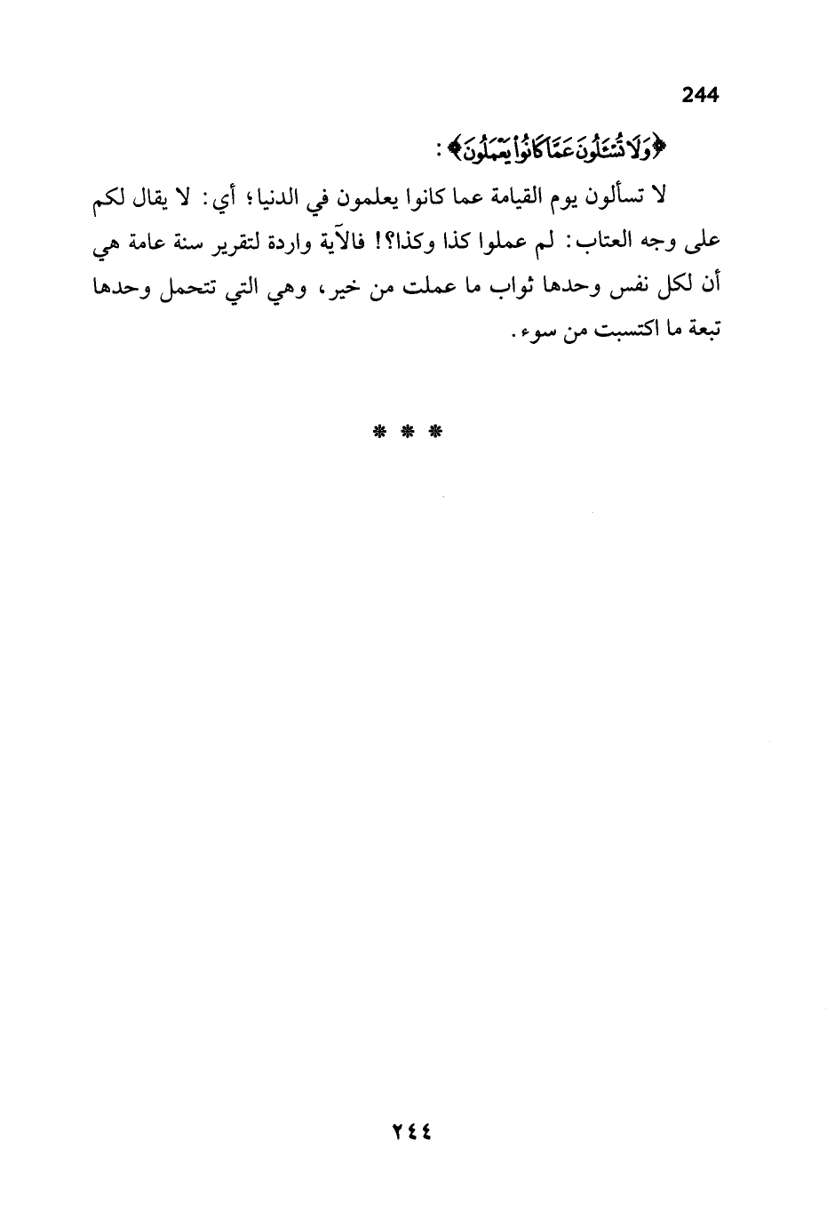 لا تسألون يوم القيامة عما كانوا يعلمون في الدنيا؛ أي: لا يقال لكم على وجه العتاب: لم عملوا كذا وكذا؟! فالآية واردة لتقرير سنة عامة هي أن لكل نفس وحدها ثواب ما عملت من خير، وهي التي تتحمل وحدها تبعة ما اكتسبت من سوء.