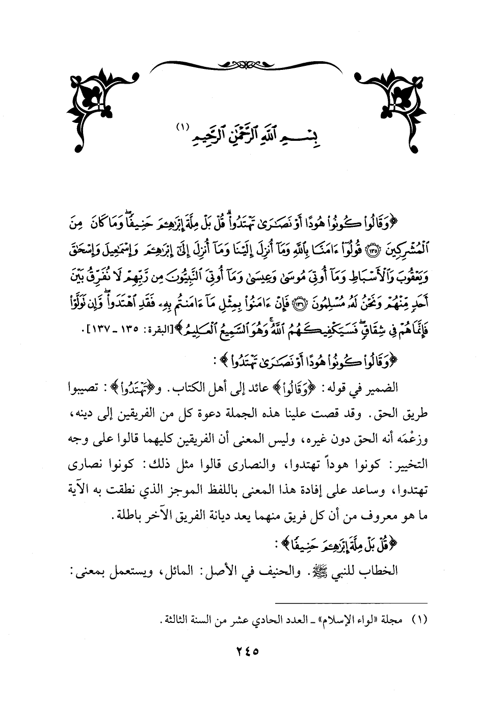 {وَقَالُوا كُونُوا هُودًا أَوْ نَصَارَى تَهْتَدُوا قُلْ بَلْ مِلَّةَ إِبْرَاهِيمَ حَنِيفًا وَمَا كَانَ مِنَ الْمُشْرِكِينَ (135) قُولُوا آمَنَّا بِاللَّهِ وَمَا أُنْزِلَ إِلَيْنَا وَمَا أُنْزِلَ إِلَى إِبْرَاهِيمَ وَإِسْمَاعِيلَ وَإِسْحَاقَ وَيَعْقُوبَ وَالْأَسْبَاطِ وَمَا أُوتِيَ مُوسَى وَعِيسَى وَمَا أُوتِيَ النَّبِيُّونَ مِنْ رَبِّهِمْ لَا نُفَرِّقُ بَيْنَ أَحَدٍ مِنْهُمْ وَنَحْنُ لَهُ مُسْلِمُونَ (136) فَإِنْ آمَنُوا بِمِثْلِ مَا آمَنْتُمْ بِهِ فَقَدِ اهْتَدَوْا وَإِنْ تَوَلَّوْا فَإِنَّمَا هُمْ فِي شِقَاقٍ فَسَيَكْفِيكَهُمُ اللَّهُ وَهُوَ السَّمِيعُ الْعَلِيمُ} [لبقرة: 135 - 137].