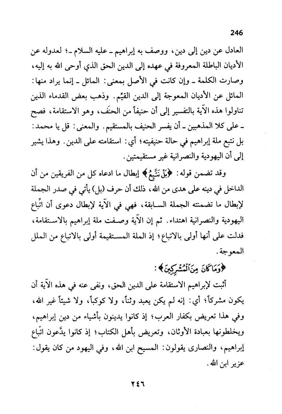 العادل عن دين إلى دين، ووصف به إبراهيم - عليه السلام -؛ لعدوله عن الأديان الباطلة المعروفة في عهده إلى الدين الحق الذي أوحى الله به إليه، وصارت الكلمة - وإن كانت في الأصل بمعنى: المائل - إنما يراد منها: المائل عن الأديان المعوجة إلى الدين القيِّم. وذهب بعض القدماء الذين تناولوا هذه الآية بالتفسير إلى أن حنيفاً من الحنَف، وهو الاستقامة، فصح -على كلا المذهبين- أن يفسر الحنيف بالمستقيم. والمعنى: قل يا محمد: بل نتبع ملة إبراهيم في حالة حنيفيته؛ أي: استقامته على الدين. وهذا يشير إلى أن اليهودية والنصرانية غير مستقيمتين.