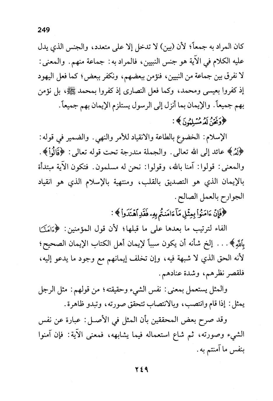 وقد صرح بعض المحققين بأن المثل في الأصل: عبارة عن نفس الشيء وصورته، ثم شاع استعماله فيما يشابهه، فمعنى الآية: فإن آمنوا بنفس ما آمنتم به.