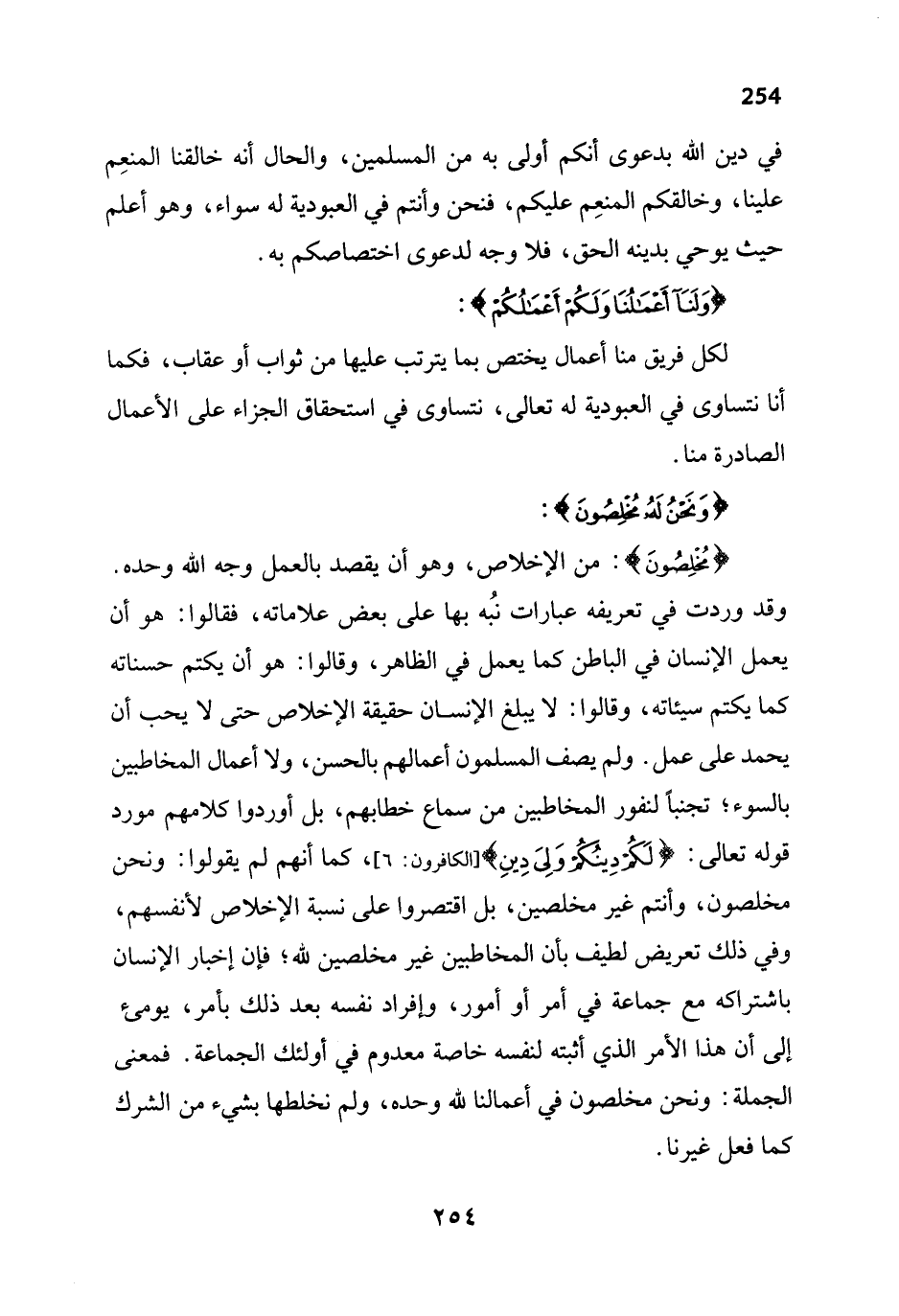 {مُخْلِصُونَ}: من الإخلاص، وهو أن يقصد بالعمل وجه الله وحده. وقد وردت في تعريفه عبارات نبُه بها على بعض علاماته، فقالوا: هو أن يعمل الإنسان في الباطن كما يعمل في الظاهر، وقالوا: هو أن يكتم حسناته كما يكتم سيئاته، وقالوا: لا يبلغ الإنسان حقيقة الإخلاص حتى لا يحب أن يحمد على عمل. ولم يصف المسلمون أعمالهم بالحسن، ولا أعمال المخاطبين بالسوء؛ تجنباً لنفور المخاطبين من سماع خطابهم، بل أوردوا كلامهم مورد قوله تعالى: {لَكُمْ دِينُكُمْ وَلِيَ دِينِ} [الكافرون: 6]، كما أنهم لم يقولوا: ونحن مخلصون، وأنتم غير مخلصين، بل اقتصروا على نسبة الإخلاص لأنفسهم، وفي ذلك تعريض لطيف بأن المخاطبين غير مخلصين لله؛ فإن إخبار الإنسان باشتراكه مع جماعة في أمر أو أمور، وإفراد نفسه بعد ذلك بأمر، يومئ إلى أن هذا الأمر الذي أثبته لنفسه خاصة معدوم في أولئك الجماعة. فمعنى الجملة: ونحن مخلصون في أعمالنا لله وحده، ولم نخلطها بشيء من الشرك كما فعل غيرنا.