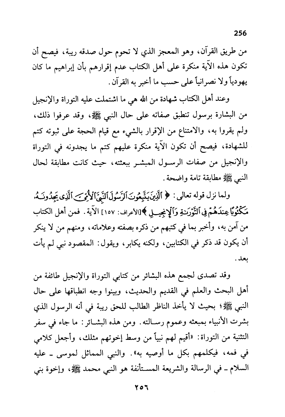 وقد تصدى لجمع هذه البشائر من كتابي اْلتوراة والإنجيل طائفة من أهل البحث والعلم في القديم والحديث، وبينوا وجه انطباقها على حال النبي - صلى الله عليه وسلم -؛ بحيث لا يأخذ الناظر الطالب للحق ريبة في أنه الرسول الذي بشرت الأنبياء بمبعثه وعموم رسالته. ومن هذه البشائر: ما جاء في سفر التثنية من التوراة: "أقيم لهم نبياً من وسط إخوتهم مثلك، وأجعل كلامي في فمه، فيكلمهم بكل ما أوصيه به". والنبي المماثل لموسى -عليه السلام- في الرسالة والشريعة المستأنفة هو النبي محمد - صلى الله عليه وسلم -، وإخوة بني