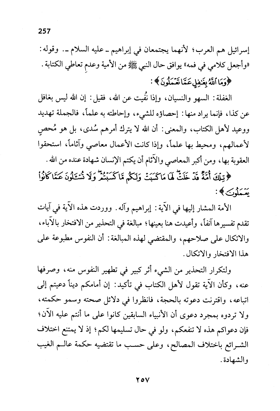 الأمة المشار إليها في الآية: إبراهيم وآله. ووردت هذه الآية في آيات تقدم تفسيرها آنفاً، وأعيدت هنا بعينها؛ مبالغة في التحذير من الافتخار بالآباء، والاتكال على صلاحهم، والمقتضي لهذه المبالغة: أن النفوس مطبوعة على هذا الافتخار والاتكال.
