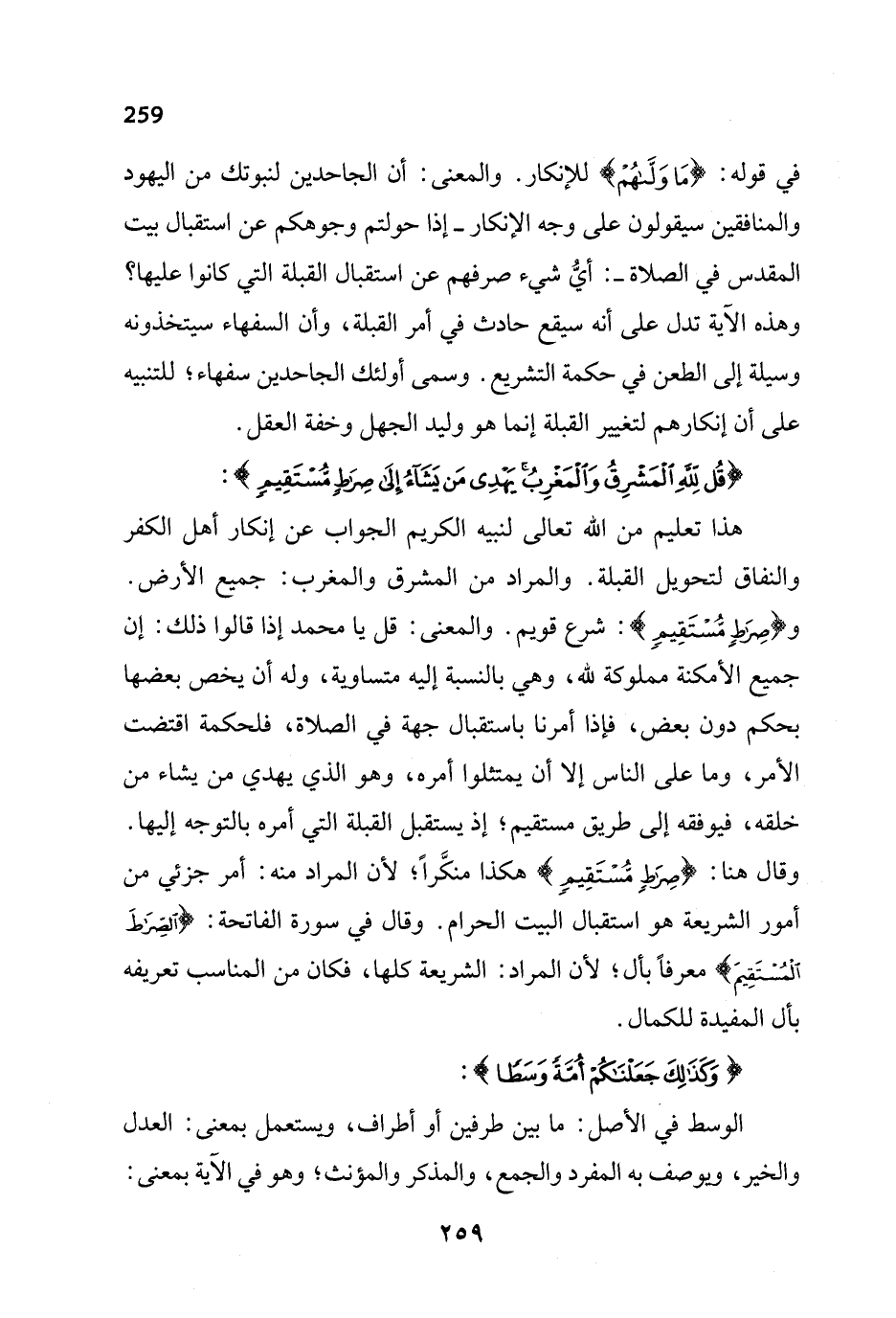 هذا تعليم من الله تعالى لنبيه الكريم الجواب عن إنكار أهل الكفر والنفاق لتحويل القبلة. والمراد من المشرق والمغرب: جميع الأرض. {صِرَاطٍ مُسْتَقِيمٍ}: شرع قويم. والمعنى: قل يا محمد إذا قالوا ذلك: إن جميع الأمكنة مملوكة لله، وهي بالنسبة إليه متساوية، وله أن يخص بعضها بحكم دون بعض، فإذا أمرنا باستقبال جهة في الصلاة، فلحكمة اقتضت الأمر، وما على الناس إلا أن يمتثلوا أمره، وهو الذي يهدي من يشاء من خلقه، فيوفقه إلى طريق مستقيم؛ إذ يستقبل القبلة التي أمره بالتوجه إليها. وقال هنا: {صِرَاطٍ مُسْتَقِيمٍ} هكذا منكَّراً؛ لأن المراد منه: أمر جزئي من أمور الشريعة هو استقبال البيت الحرام. وقال في سورة الفاتحة: {الصِّرَاطَ الْمُسْتَقِيمَ} معرفاً بأل؛ لأن المراد: الشريعة كلها، فكان من المناسب تعريفه بأل المفيدة للكمال.