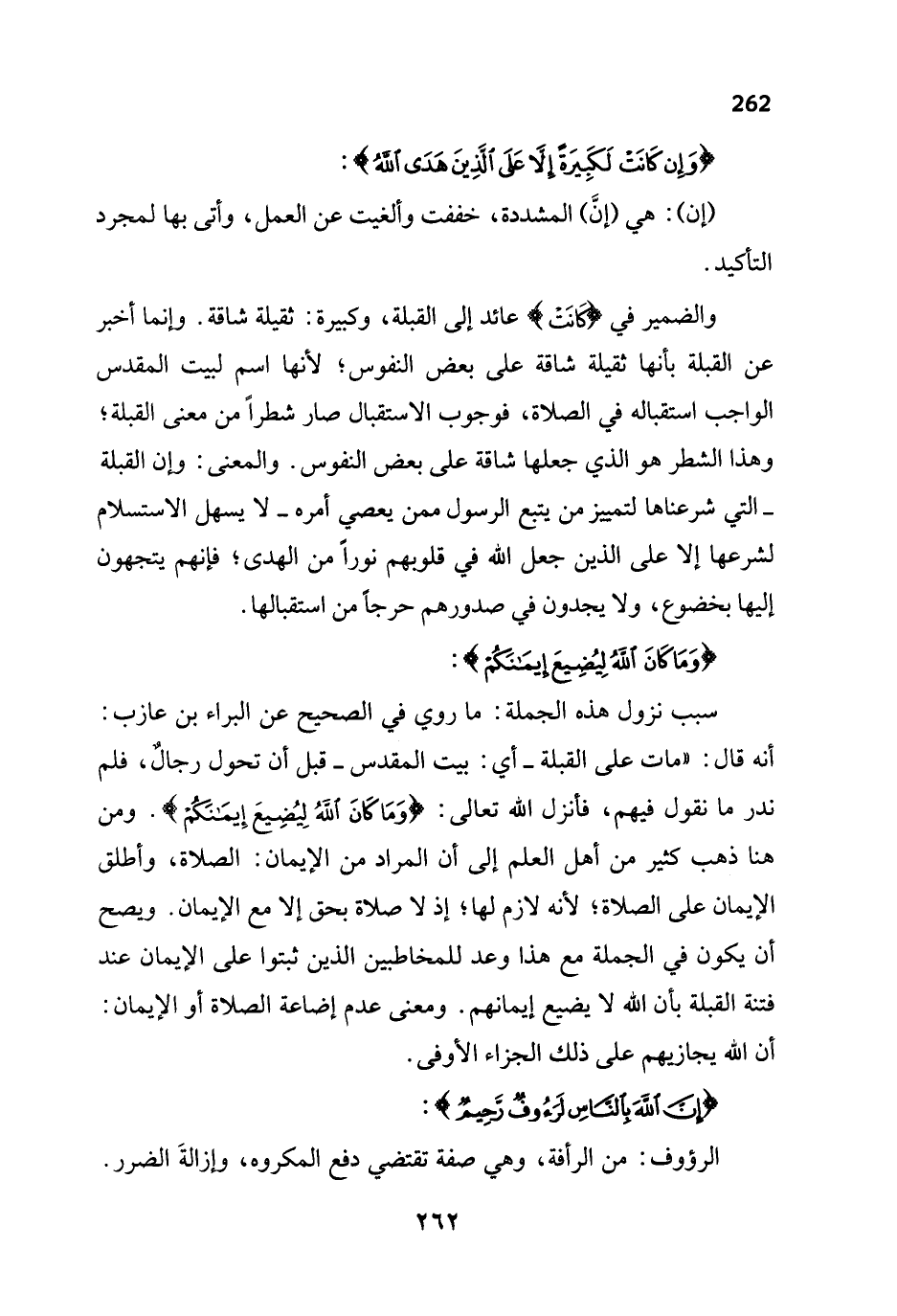 والضمير في {كَانَتْ} عائد إلى القبلة، وكبيرة: ثقيلة شاقة. وإنما أخبر عن القبلة بأنها ثقيلة شاقة على بعض النفوس؛ لأنها اسم لبيت المقدس الواجب استقباله في الصلاة، فوجوب الاستقبال صار شطراً من معنى القبلة؛ وهذا الشطر هو الذي جعلها شاقة على بعض النفوس. والمعنى: وإن القبلة -التي شرعناها لتمييز من يتبع الرسول ممن يعصي أمره- لا يسهل الاستسلام لشرعها إلا على الذين جعل الله في قلويهم نوراً من الهدى؛ فإنهم يتجهون إليها بخضوع، ولا يجدون في صدورهم حرجاً من استقبالها.