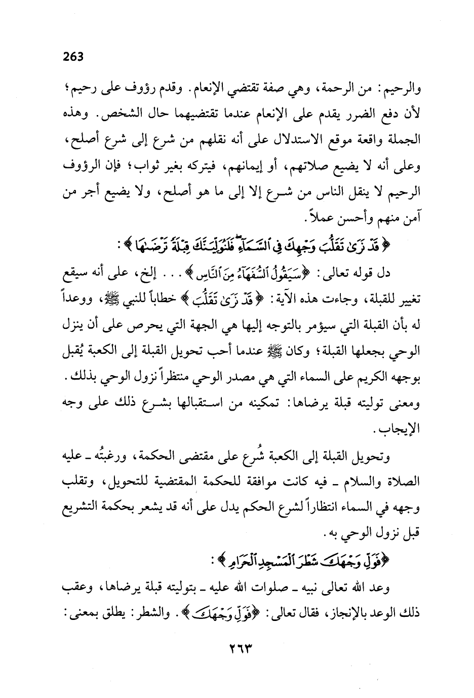 دل قوله تعالى: {سَيَقُولُ السُّفَهَاءُ مِنَ النَّاسِ}. . . إلخ، على أنه سيقع تغيير للقبلة، وجاءت هذه الآية: {قَدْ نَرَى تَقَلُّبَ} خطاباً للنبي - صلى الله عليه وسلم -، ووعداً له بأن القبلة التي سيؤمر بالتوجه إليها هي الجهة التي يحرص على أن ينزل الوحي بجعلها القبلة؛ وكان - صلى الله عليه وسلم - عندما أحب تحويل القبلة إلى الكعبة يُقبل بوجهه الكريم على السماء التي هي مصدر الوحي منتظراً نزول الوحي بذلك. ومعنى توليته قبلة يرضاها: تمكينه من استقبالها بشرع ذلك على وجه الإيجاب.