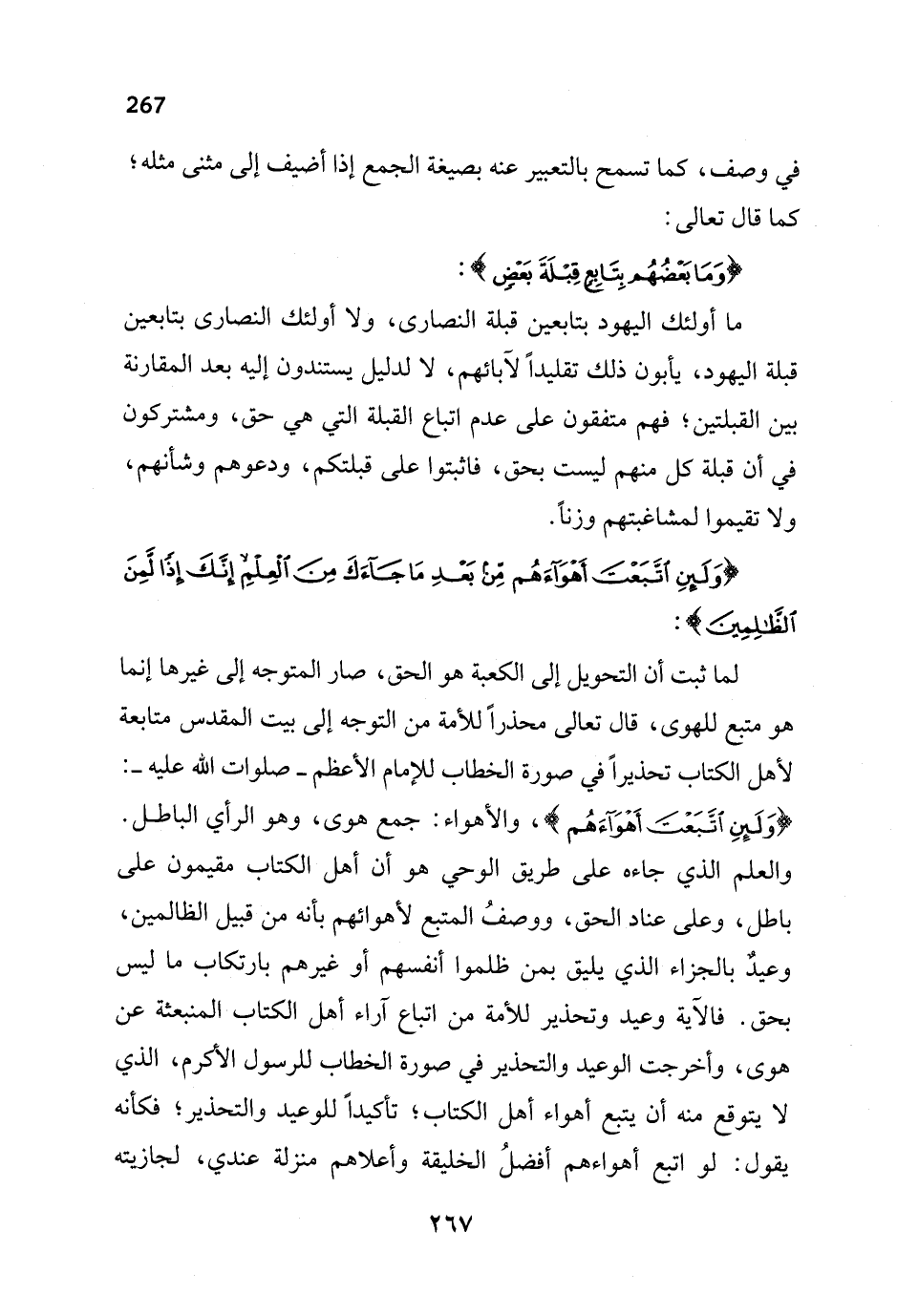 والعلم الذي جاءه على طريق الوحي هو أن أهل الكتاب مقيمون على باطل، وعلى عناد الحق، ووصفُ المتبع لأهوائهم بأنه من قبيل الظالمين، وعيدٌ بالجزاء الذي يليق بمن ظلموا أنفسهم أو غيرهم بارتكاب ما ليس بحق. فالآية وعيد وتحذير للأمة من اتباع آراء أهل الكتاب المنبعثة عن هوى، وأخرجت الوعيد والتحذير في صورة الخطاب للرسول الأكرم، الذي لا يتوقع منه أن يتبع أهواء أهل الكتاب؛ تأكيداً للوعيد والتحذير؛ فكأنه يقول: لو اتبع أهواءهم أفضلُ الخليقة وأعلاهم منزلة عندي، لجازيته
