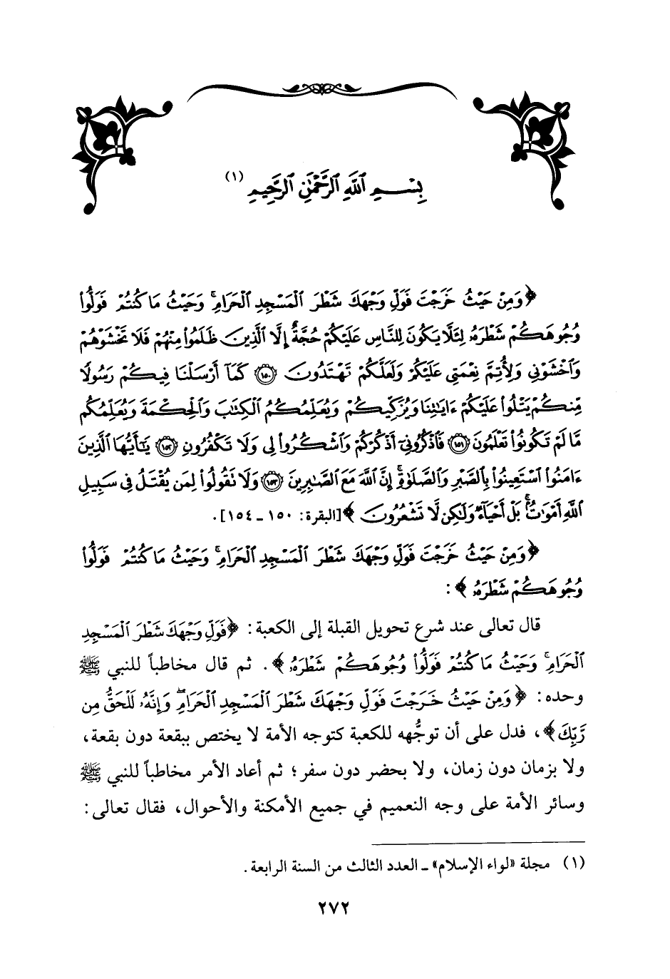 {وَمِنْ حَيْثُ خَرَجْتَ فَوَلِّ وَجْهَكَ شَطْرَ الْمَسْجِدِ الْحَرَامِ وَحَيْثُ مَا كُنْتُمْ فَوَلُّوا وُجُوهَكُمْ شَطْرَهُ لِئَلَّا يَكُونَ لِلنَّاسِ عَلَيْكُمْ حُجَّةٌ إِلَّا الَّذِينَ ظَلَمُوا مِنْهُمْ فَلَا تَخْشَوْهُمْ وَاخْشَوْنِي وَلِأُتِمَّ نِعْمَتِي عَلَيْكُمْ وَلَعَلَّكُمْ تَهْتَدُونَ (150) كَمَا أَرْسَلْنَا فِيكُمْ رَسُولًا مِنْكُمْ يَتْلُو عَلَيْكُمْ آيَاتِنَا وَيُزَكِّيكُمْ وَيُعَلِّمُكُمُ الْكِتَابَ وَالْحِكْمَةَ وَيُعَلِّمُكُمْ مَا لَمْ تَكُونُوا تَعْلَمُونَ (151) فَاذْكُرُونِي أَذْكُرْكُمْ وَاشْكُرُوا لِي وَلَا تَكْفُرُونِ (152) يَاأَيُّهَا الَّذِينَ آمَنُوا اسْتَعِينُوا بِالصَّبْرِ وَالصَّلَاةِ إِنَّ اللَّهَ مَعَ الصَّابِرِينَ (153) وَلَا تَقُولُوا لِمَنْ يُقْتَلُ فِي سَبِيلِ اللَّهِ أَمْوَاتٌ بَلْ أَحْيَاءٌ وَلَكِنْ لَا تَشْعُرُونَ} [البقرة: 150 - 154].