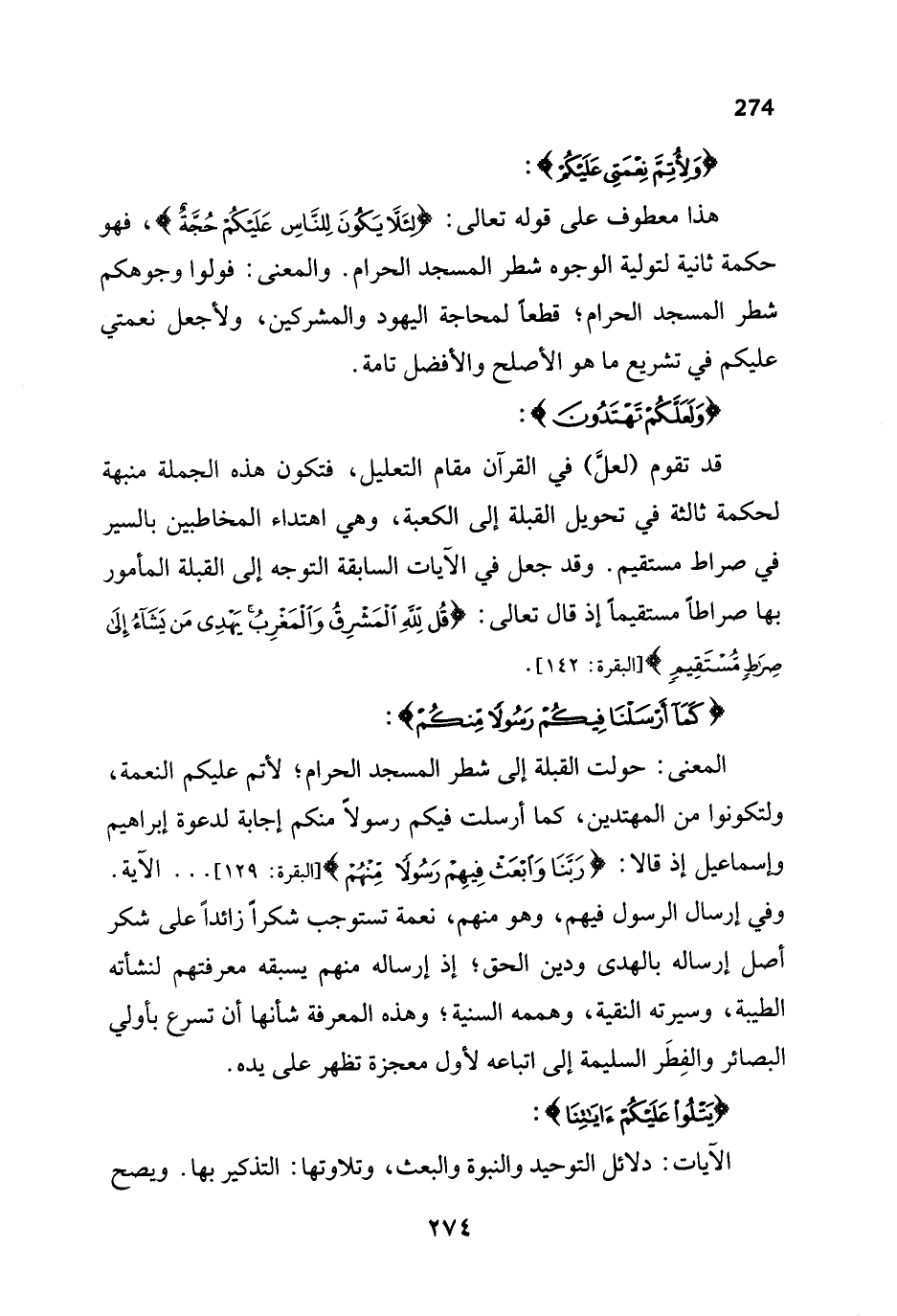 هذا معطوف على قوله تعالى: {لِئَلَّا يَكُونَ لِلنَّاسِ عَلَيْكُمْ حُجَّةٌ}، فهو حكمة ثانية لتولية الوجوه شطر المسجد الحرام. والمعنى: فولوا وجوهكم شطر المسجد الحرام؛ قطعاً لمحاجة اليهود والمشركين، ولأجعل نعمتي عليكم في تشريع ما هو الأصلح والأفضل تامة.
