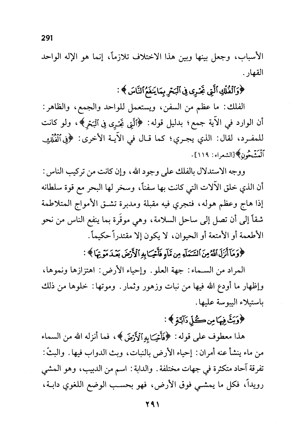 ووجه الاستدلال بالفلك على وجود الله، وإن كانت من تركيب الناس: أن الذي خلق الآلات التي كانت بها سفناً، وسخر لها البحر مع قوة سلطانه إذا هاج وعظم هوله، فتجري فيه مقبلة ومدبرة تشق الأمواج المتلاطمة شقاً إلى أن تصل إلى ساحل السلامة، وهي موقَرة بما ينفع الناس من نحو الأطعمة أو الأمتعة أو الحيوان، لا يكون إلا مقتدراً حكيماً.