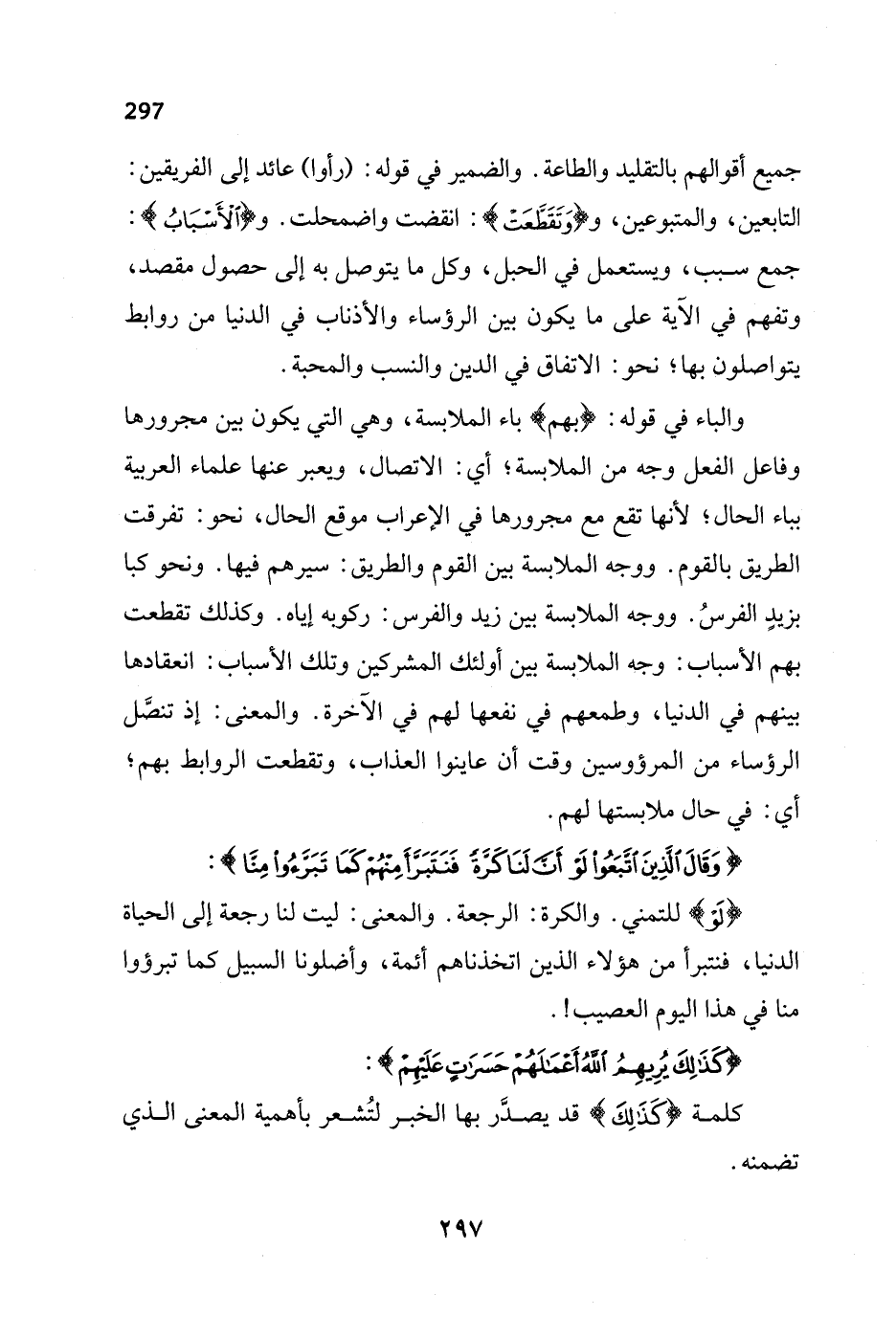 والباء في قوله: {بِهِمُ} باء الملابسة، وهي التي يكون بين مجرورها وفاعل الفعل وجه من الملابسة؛ أي: الاتصال، ويعبر عنها علماء العربية بباء الحال؛ لأنها تقع مع مجرورها في الإعراب موقع الحال، نحو: تفرقت الطريق بالقوم. ووجه الملابسة بين القوم والطريق: سيرهم فيها. ونحو كبا بزيدٍ الفرسُ. ووجه الملابسة بين زيد والفرس: ركوبه إياه. وكذلك تقطعت بهم الأسباب: وجه الملابسة بين أولئك المشركين وتلك الأسباب: انعقادها بينهم في الدنيا، وطمعهم في نفعها لهم في الآخرة. والمعنى: إذ تنصَّل الرؤساء من المرؤوسين وقت أن عاينوا العذاب، وتقطعت الروابط بهم؛ أي: في حال ملابستها لهم.