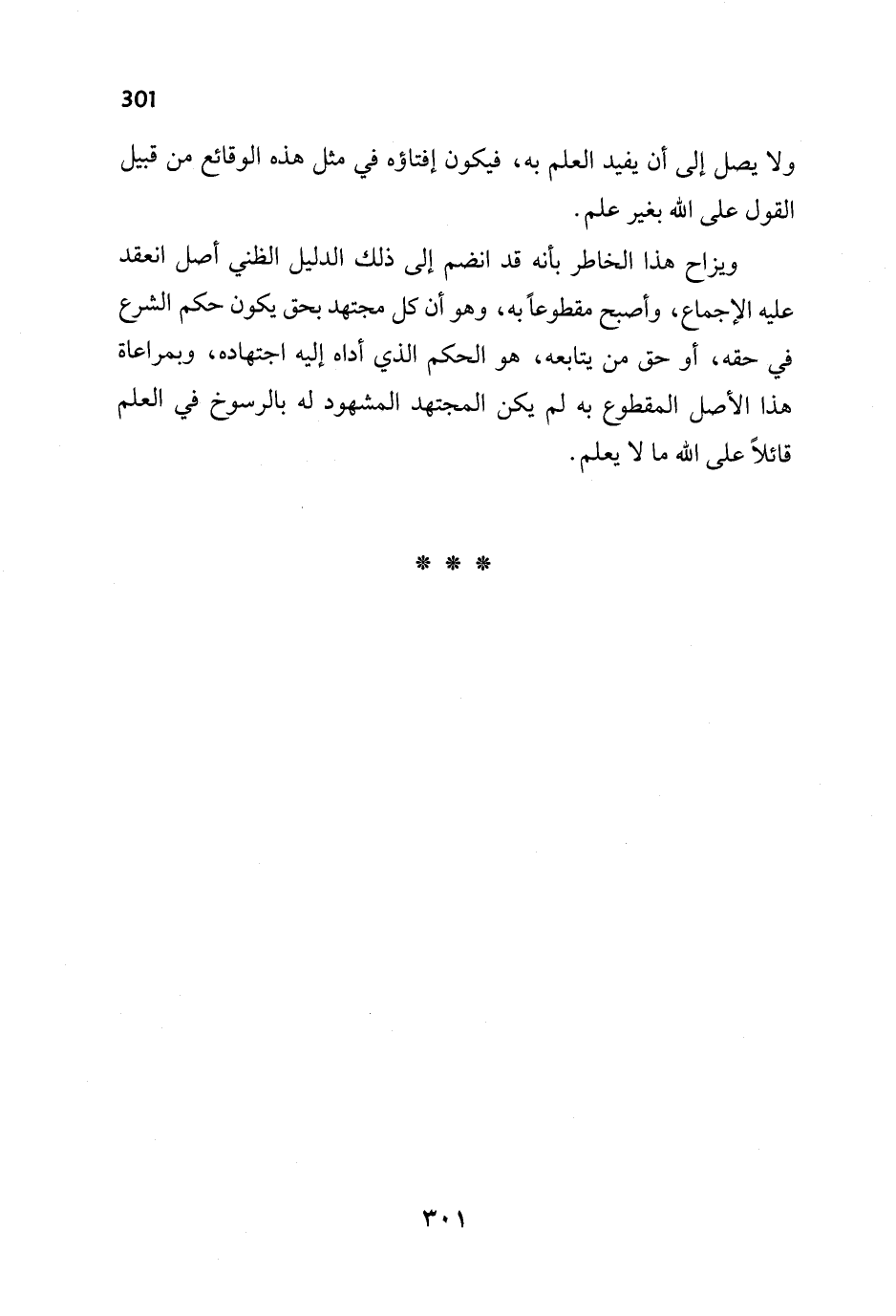 ويزاح هذا الخاطر بأنه قد انضم إلى ذلك الدليل الظني أصل انعقد عليه الإجماع، وأصبح مقطوعاً به، وهو أن كل مجتهد بحق يكون حكم الشرع في حقه، أو حق من يتابعه، هو الحكم الذي أداه إليه اجتهاده، وبمراعاة هذا الأصل المقطوع به لم يكن المجتهد المشهود له بالرسوخ في العلم قائلاً على الله ما لا يعلم.