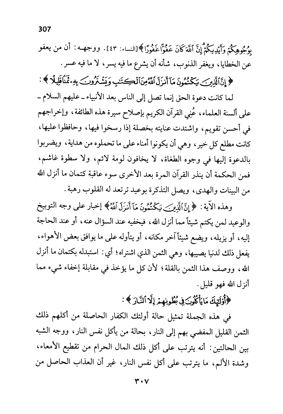 لما كانت دعوة الحق إنما تصل إلى الناس بعد الأنبياء - عليهم السلام - على ألسنة العلماء، عُنِي القرآن الكريم بإصلاح سيرة هذه الطائفة، وإخراجهم في أحسن تقويم، واشتدت عنايته بخصلة إذا رسخوا فيها، وحافظوا عليها، كانت مطلع كل خير، وهي أن يكونوا أمناء على ما تحملوه من هداية، ويضربوا بالدعوة إليها في وجوه الطغاة، لا يخافون لومة لائم، ولا سطوة غاشم، فمن الحكمة أن ينذر القرآن المرة بعد الأخرى سوء عاقبة كتمان ما أنزل الله من البينات والهدى، ويصل التذكرة بوعيد ترتعد له القلوب رهبة.