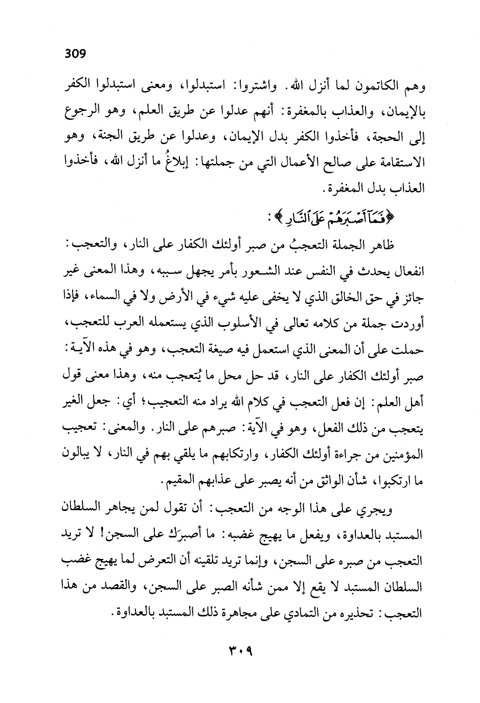 ظاهر الجملة التعجبُ من صبر أولئك الكفار على النار، والتعجب: انفعال يحدث في النفس عند الشعور بأمر يجهل سببه، وهذا المعنى غير جائز في حق الخالق الذي لا يخفى عليه شيء في الأرض ولا في السماء، فإذا أوردت جملة من كلامه تعالى في الأسلوب الذي يستعمله العرب للتعجب، حملت على أن المعنى الذي استعمل فيه صيغة التعجب، وهو في هذه الآية: صبر أولئك الكفار على النار، قد حل محل ما يُتعجب منه، وهذا معنى قول أهل العلم: إن فعل التعجب في كلام الله يراد منه التعجيب؛ أي: جعل الغير يتعجب من ذلك الفعل، وهو في الآية: صبرهم على النار. والمعنى: تعجيب المؤمنين من جراءة أولئك الكفار، وارتكابهم ما يلقي بهم في النار، لا يبالون ما ارتكبوا، شأن الواثق من أنه يصبر على عذابهم المقيم.