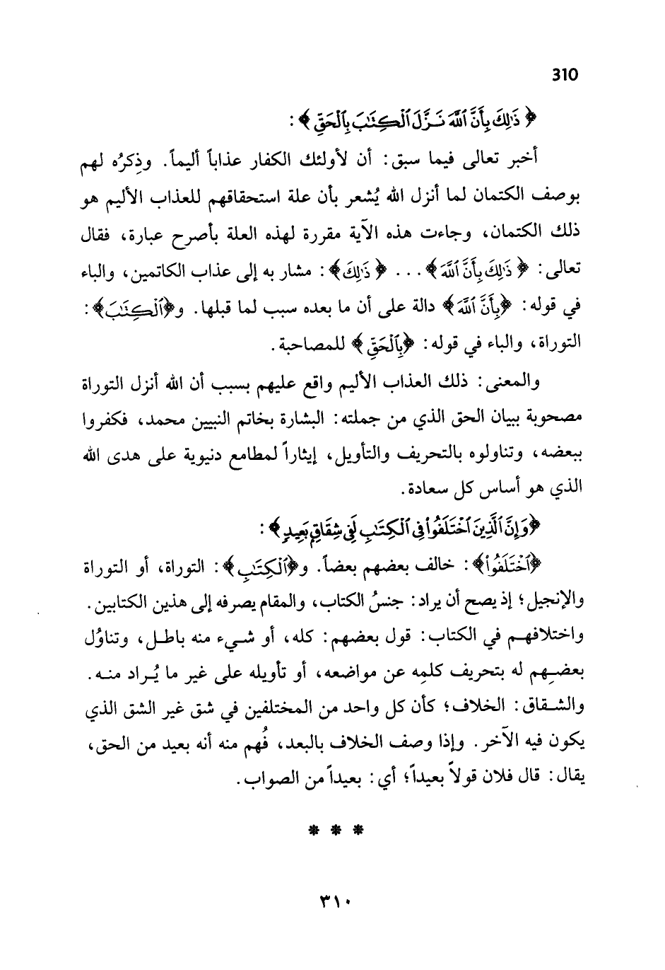 أخبر تعالى فيما سبق: أن لأولئك الكفار عذاباً أليماً. وذِكرُه لهم بوصف الكتمان لما أنزل الله يُشعر بأن علة استحقاقهم للعذاب الأليم هو ذلك الكتمان، وجاءت هذه الآية مقررة لهذه العلة بأصرح عبارة، فقال تعالى: {ذَلِكَ بِأَنَّ اللَّهَ}. . . {ذَلِكَ}: مشار به إلى عذاب الكاتمين، والباء في قوله: {بِأَنَّ اللَّهَ} دالة على أن ما بعده سبب لما قبلها. و {الْكِتَابَ}: التوراة، والباء في قوله: {بِالْحَقِّ} للمصاحبة.