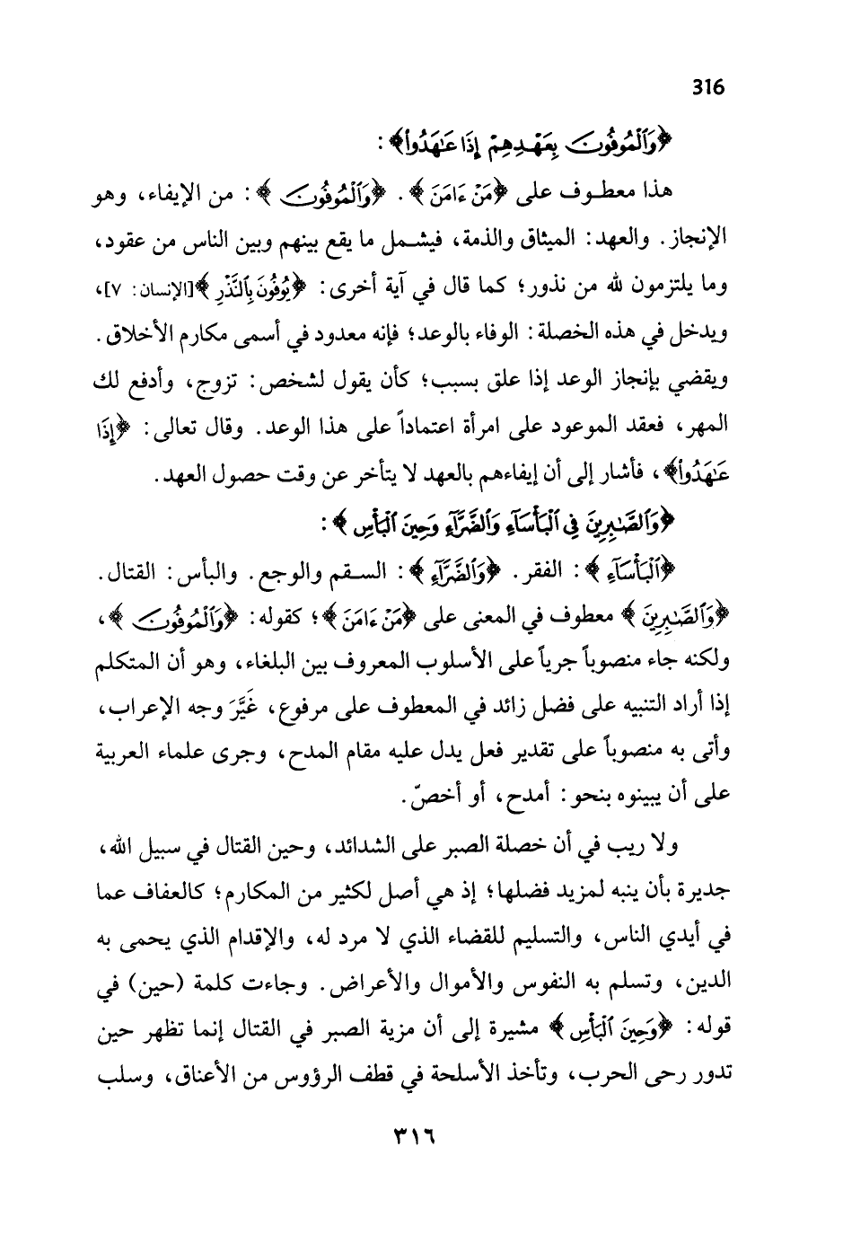 {الْبَأْسَاءِ}: الفقر. {وَالضَّرَّاءِ}: السقم والوجع. والبأس: القتال. {وَالصَّابِرِينَ} معطوف في المعنى على {مَنْ آمَنَ}؛ كقوله: {وَالْمُوفُونَ}، ولكنه جاء منصوباً جرياً على الأسلوب المعروف بين البلغاء، وهو أن المتكلم إذا أراد التنبيه على فضل زائد في المعطوف على مرفوع، غَيَّرَ وجه الإعراب، وأتى به منصوباً على تقدير فعل يدل عليه مقام المدح، وجرى علماء العربية على أن يبينوه بنحو: أمدح، أو أخصّ.