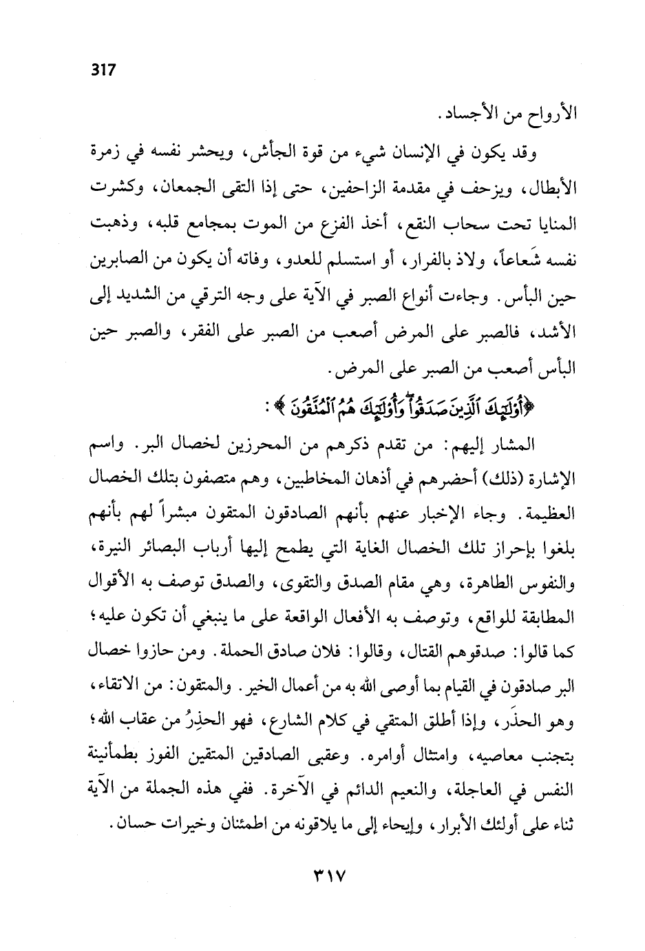 وقد يكون في الإنسان شيء من قوة الجأش، ويحشر نفسه في زمرة الأبطال، ويزحف في مقدمة الزاحفين، حتى إذا التقى الجمعان، وكشرت المنايا تحت سحاب النقع، أخذ الفزع من الموت بمجامع قلبه، وذهبت نفسه شَعاعاً، ولاذ بالفرار، أو استسلم للعدو، وفاته أن يكون من الصابرين حين البأس. وجاءت أنواع الصبر في الآية على وجه الترقي من الشديد إلى الأشد، فالصبر على المرض أصعب من الصبر على الفقر، والصبر حين البأس أصعب من الصبر على المرض.