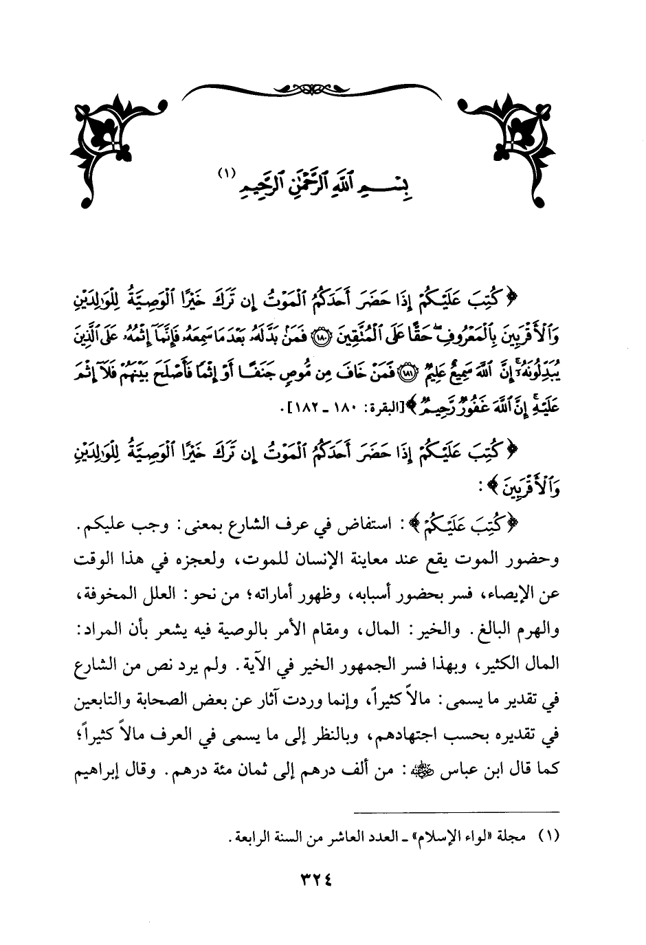 {كُتِبَ عَلَيْكُمْ إِذَا حَضَرَ أَحَدَكُمُ الْمَوْتُ إِنْ تَرَكَ خَيْرًا الْوَصِيَّةُ لِلْوَالِدَيْنِ وَالْأَقْرَبِينَ بِالْمَعْرُوفِ حَقًّا عَلَى الْمُتَّقِينَ (180) فَمَنْ بَدَّلَهُ بَعْدَ مَا سَمِعَهُ فَإِنَّمَا إِثْمُهُ عَلَى الَّذِينَ يُبَدِّلُونَهُ إِنَّ اللَّهَ سَمِيعٌ عَلِيمٌ (181) فَمَنْ خَافَ مِنْ مُوصٍ جَنَفًا أَوْ إِثْمًا فَأَصْلَحَ بَيْنَهُمْ فَلَا إِثْمَ عَلَيْهِ إِنَّ اللَّهَ غَفُورٌ رَحِيمٌ} [البقرة: 180 - 182].