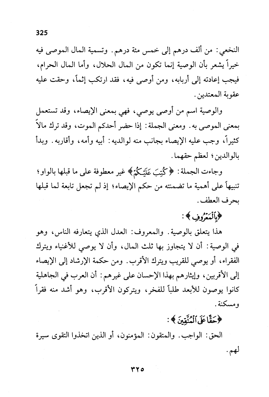 النخعي: من ألف درهم إلى خمس مئة درهم. وتسمية المال الموصى فيه خيراً يشعر بأن الوصية إنما تكون من المال الحلال، وأما المال الحرام، فيجب إعادته إلى أربابه، ومن أوصى فيه، فقد ارتكب إثماً، وحقت عليه عقوبة المعتدين.