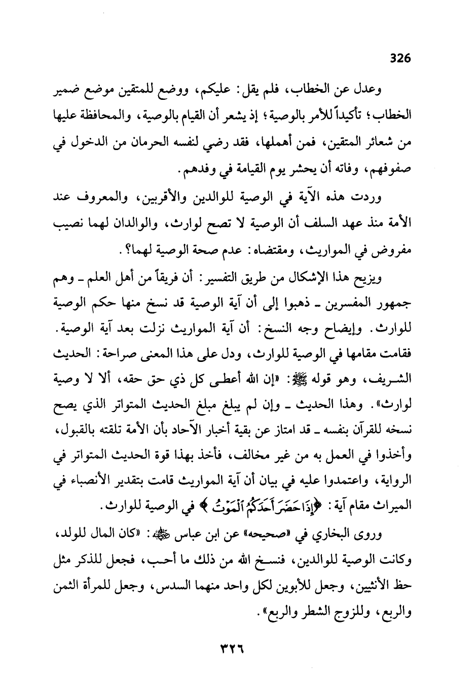 ويزيح هذا الإشكال من طريق التفسير: أن فريقاً من أهل العلم -وهم جمهور المفسرين- ذهبوا إلى أن آية الوصية قد نسخ منها حكم الوصية للوارث. وإيضاح وجه النسخ: أن آية المواريث نزلت بعد آية الوصية. فقامت مقامها في الوصية للوارث، ودل على هذا المعنى صراحة: الحديث الشريف، وهو قوله - صلى الله عليه وسلم -: "إن الله أعطى كل ذي حق حقه، ألا لا وصية لوارث". وهذا الحديث -وإن لم يبلغ مبلغ الحديث المتواتر الذي يصح نسخه للقرآن بنفسه- قد امتاز عن بقية أخبار الآحاد بأن الأمة تلقته بالقبول، وأخذوا في العمل به من غير مخالف، فأخذ بهذا قوة الحديث المتواتر في الرواية، واعتمدوا عليه في بيان أن آية المواريث قامت بتقدير الأنصباء في الميراث مقام آية: {إِذَا حَضَرَ أَحَدَكُمُ الْمَوْتُ} في الوصية للوارث.