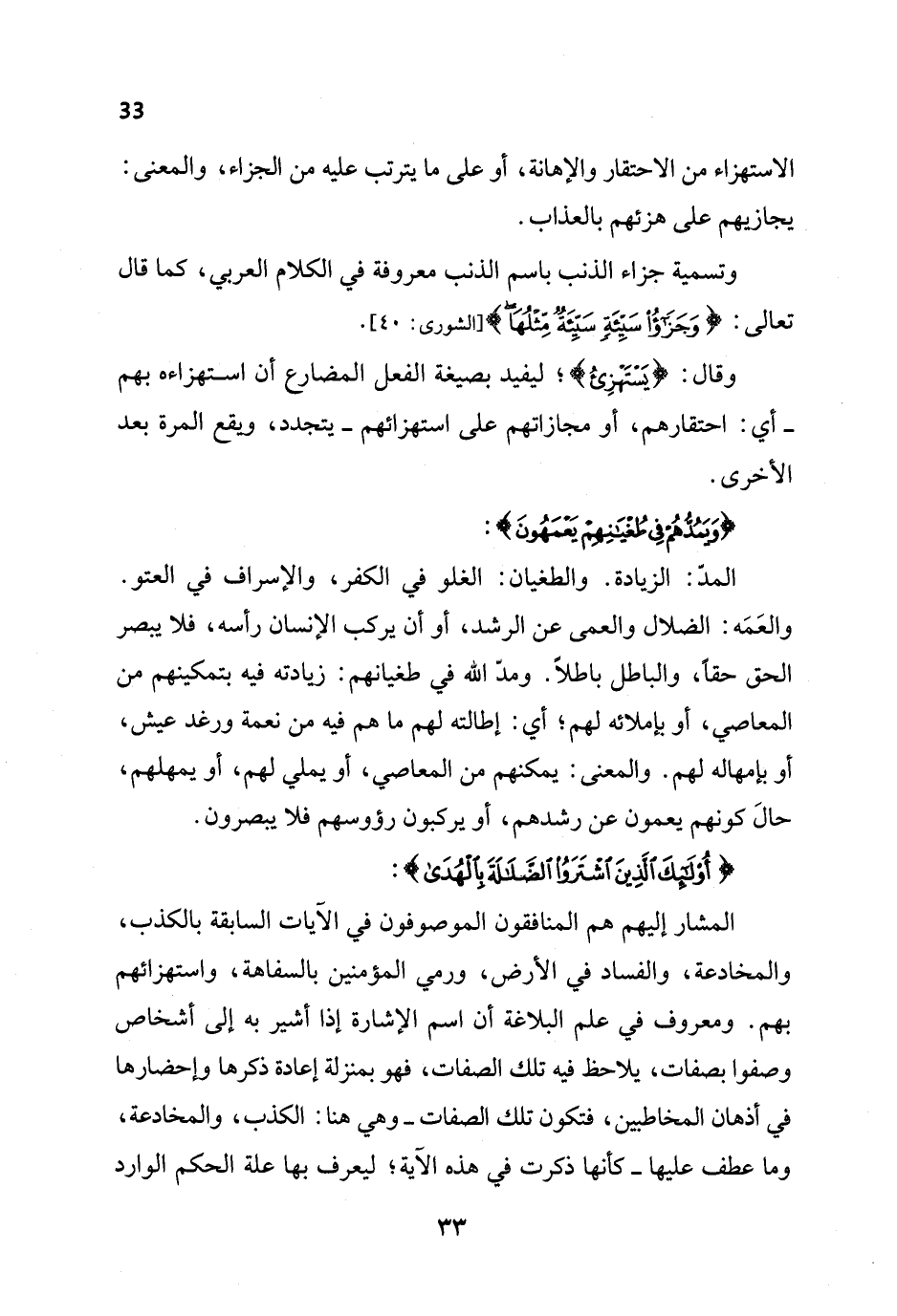 المدّ: الزيادة. والطغيان: الغلو في الكفر، والإسراف في العتو. والعَمَه: الضلال والعمى عن الرشد، أو أن يركب الإنسان رأسه، فلا يبصر الحق حقاً، والباطل باطلاً. ومدّ الله في طغيانهم: زيادته فيه بتمكينهم من المعاصي، أو بإملائه لهم؛ أي: إطالته لهم ما هم فيه من نعمة ورغد عيش، أو بإمهاله لهم. والمعنى: يمكنهم من المعاصي، أو يملي لهم، أو يمهلهم، حالَ كونهم يعمون عن رشدهم، أو يركبون رؤوسهم فلا يبصرون.