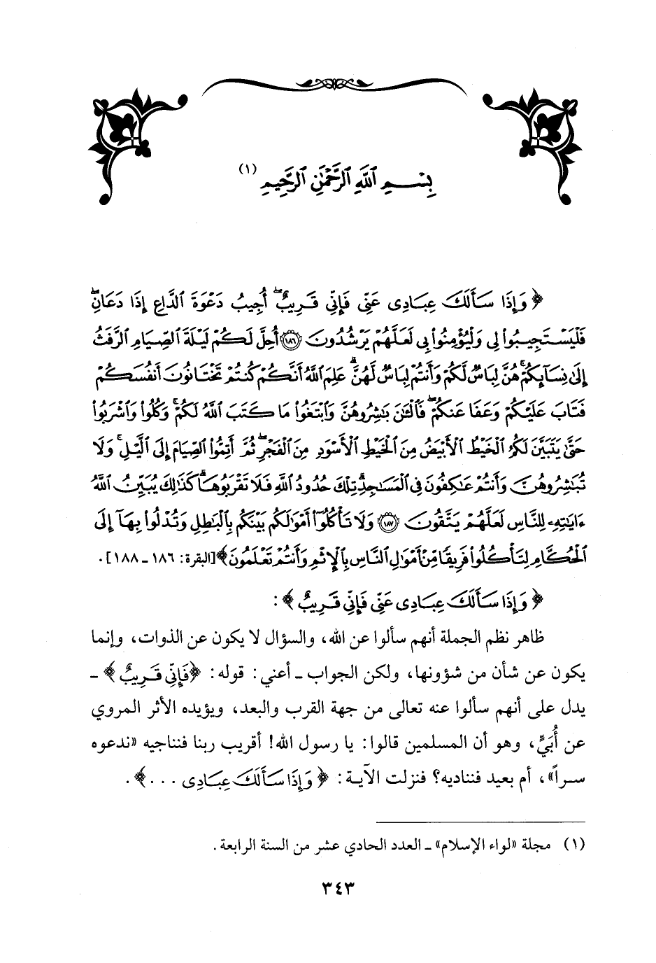 {وَإِذَا سَأَلَكَ عِبَادِي عَنِّي فَإِنِّي قَرِيبٌ أُجِيبُ دَعْوَةَ الدَّاعِ إِذَا دَعَانِ فَلْيَسْتَجِيبُوا لِي وَلْيُؤْمِنُوا بِي لَعَلَّهُمْ يَرْشُدُونَ (186) أُحِلَّ لَكُمْ لَيْلَةَ الصِّيَامِ الرَّفَثُ إِلَى نِسَائِكُمْ هُنَّ لِبَاسٌ لَكُمْ وَأَنْتُمْ لِبَاسٌ لَهُنَّ عَلِمَ اللَّهُ أَنَّكُمْ كُنْتُمْ تَخْتَانُونَ أَنْفُسَكُمْ فَتَابَ عَلَيْكُمْ وَعَفَا عَنْكُمْ فَالْآنَ بَاشِرُوهُنَّ وَابْتَغُوا مَا كَتَبَ اللَّهُ لَكُمْ وَكُلُوا وَاشْرَبُوا حَتَّى يَتَبَيَّنَ لَكُمُ الْخَيْطُ الْأَبْيَضُ مِنَ الْخَيْطِ الْأَسْوَدِ مِنَ الْفَجْرِ ثُمَّ أَتِمُّوا الصِّيَامَ إِلَى اللَّيْلِ وَلَا تُبَاشِرُوهُنَّ وَأَنْتُمْ عَاكِفُونَ فِي الْمَسَاجِدِ تِلْكَ حُدُودُ اللَّهِ فَلَا تَقْرَبُوهَا كَذَلِكَ يُبَيِّنُ اللَّهُ آيَاتِهِ لِلنَّاسِ لَعَلَّهُمْ يَتَّقُونَ (187) وَلَا تَأْكُلُوا أَمْوَالَكُمْ بَيْنَكُمْ بِالْبَاطِلِ وَتُدْلُوا بِهَا إِلَى الْحُكَّامِ لِتَأْكُلُوا فَرِيقًا مِنْ أَمْوَالِ النَّاسِ بِالْإِثْمِ وَأَنْتُمْ تَعْلَمُونَ} [البقرة: 186 - 188].