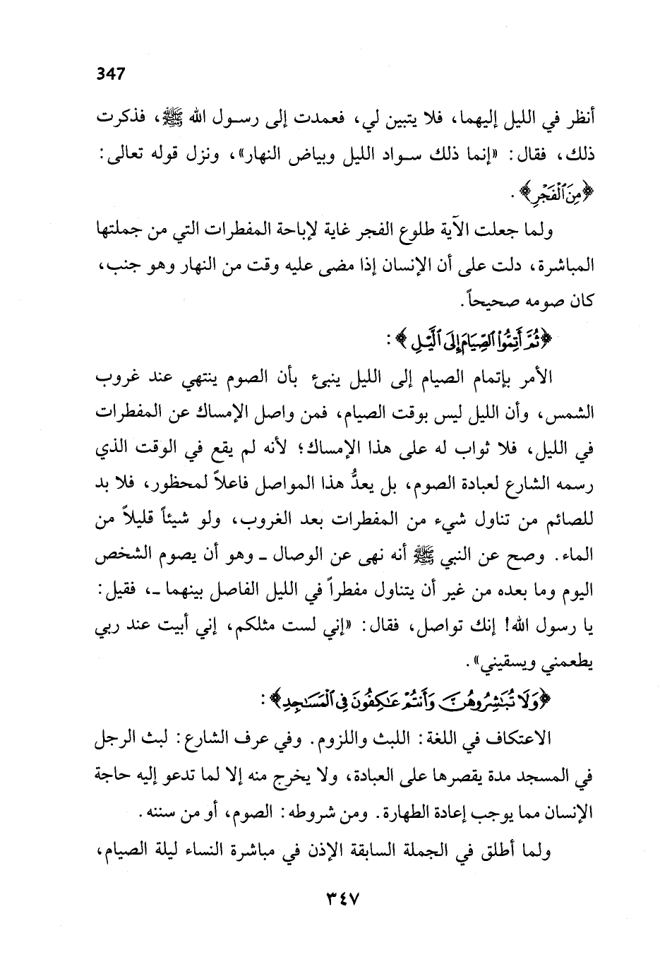 ولما جعلت الآية طلوع الفجر غاية لإباحة المفطرات التي من جملتها المباشرة، دلت على أن الإنسان إذا مضى عليه وقت من النهار وهو جنب، كان صومه صحيحاً.