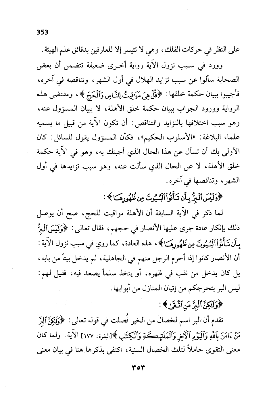 لما ذكر في الآية السابقة أن الأهلة مواقيت للحج، صح أن يوصل ذلك بإنكار عادة جرى عليها الأنصار في حجهم، فقال تعالى: {وَلَيْسَ الْبِرُّ بِأَنْ تَأْتُوا الْبُيُوتَ مِنْ ظُهُورِهَا}، هذه العادة، كما روي في سبب نزول الآية: أن الأنصار كانوا إذا أحرم الرجل منهم في الجاهلية، لم يدخل بيتاً من بابه، بل كان يدخل من نقب في ظهره، أو يتخذ سلماً يصعد فيه، فقيل لهم: ليس البر بتحرجكم من إتيان المنازل من أبوابها.